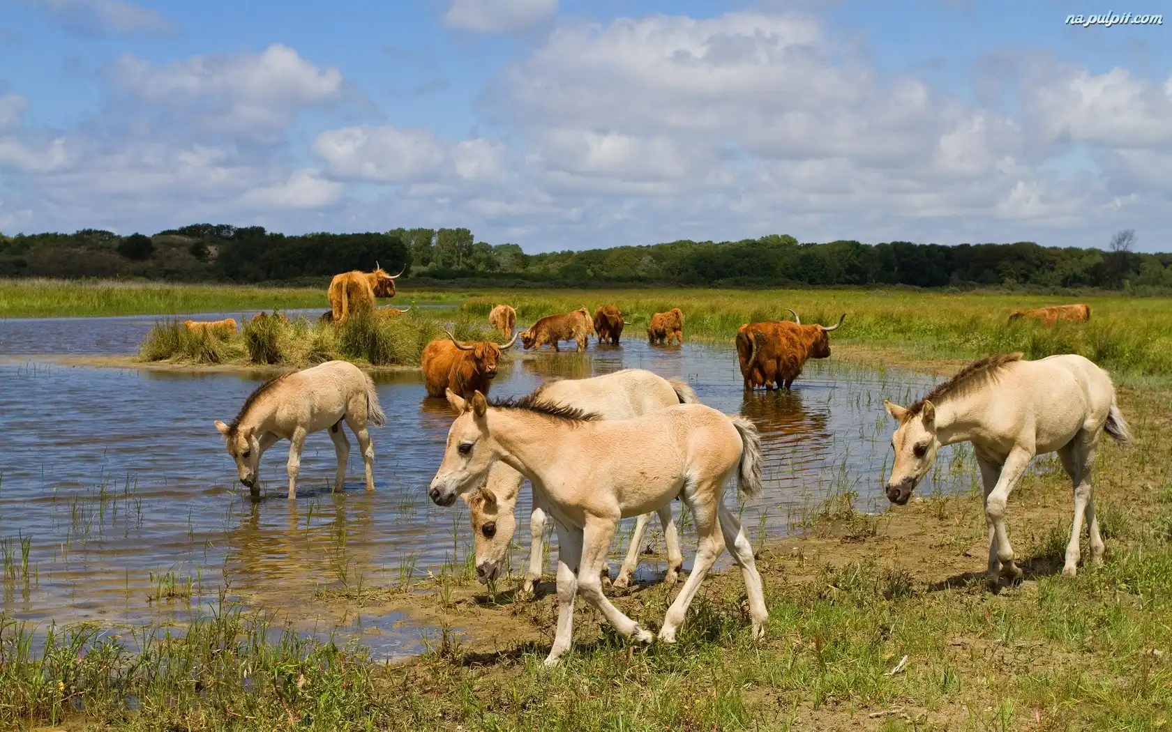 Niebo, Trawa, Woły, Źrebaki, Woda Na Pulpit