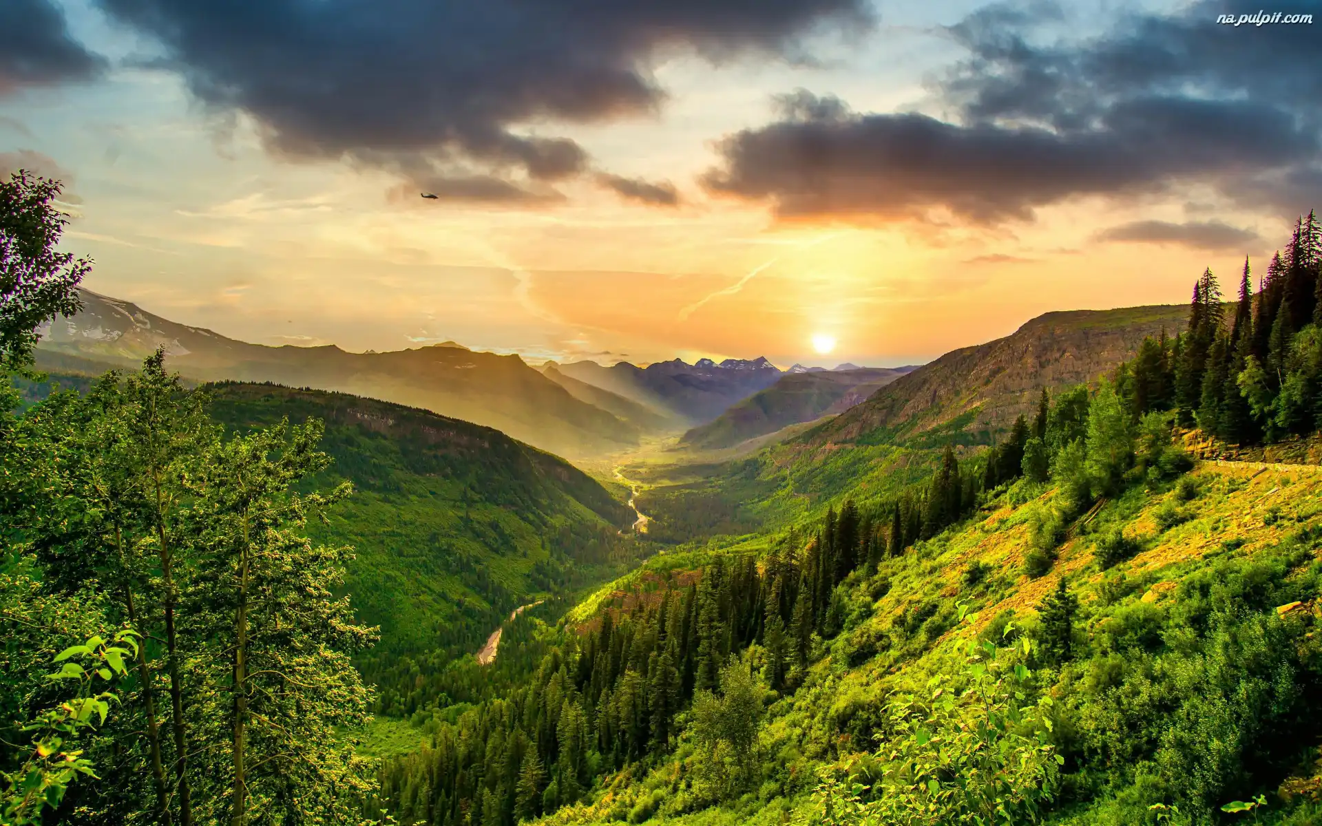 Zachód słońca, Rzeka, Dolina, Góry, Lasy, Drzewa, Niebo Na Pulpit