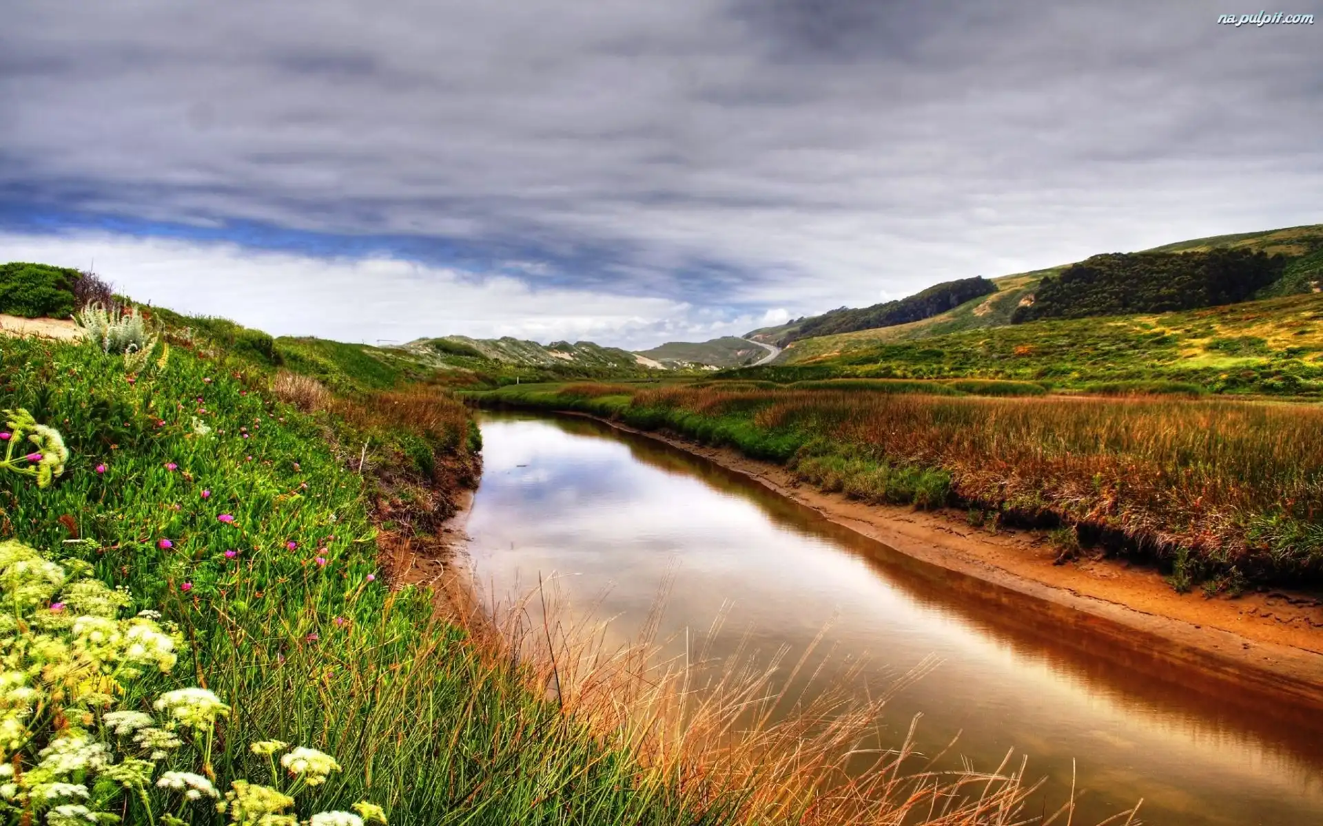 Niebo, Trawa, Rzeka, Kwiaty Na Pulpit