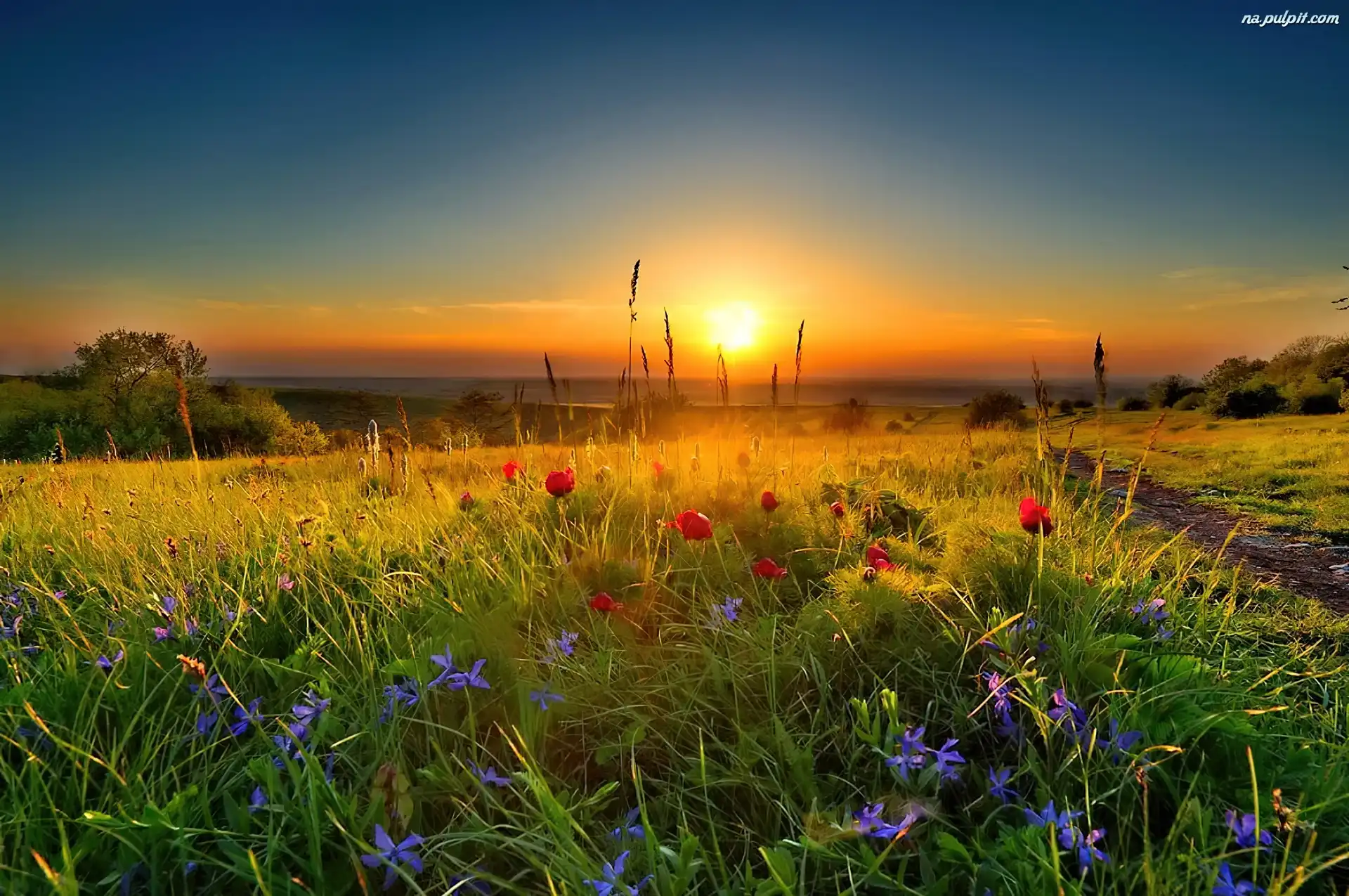 Niebo, Łąka, Zachód Słońca, Maki Na Pulpit