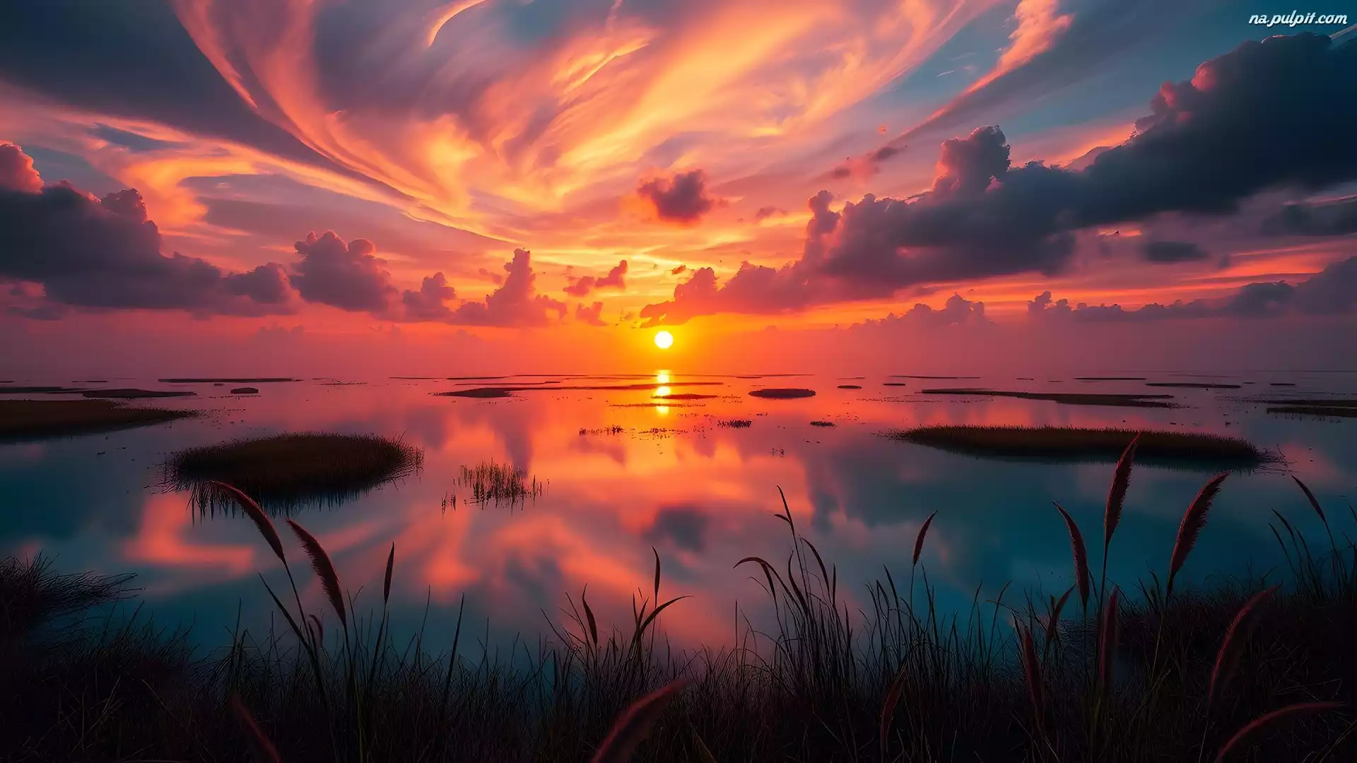Jezioro, Zachód słońca, Niebo, Chmury, Kolorowe, Rośliny Na Pulpit
