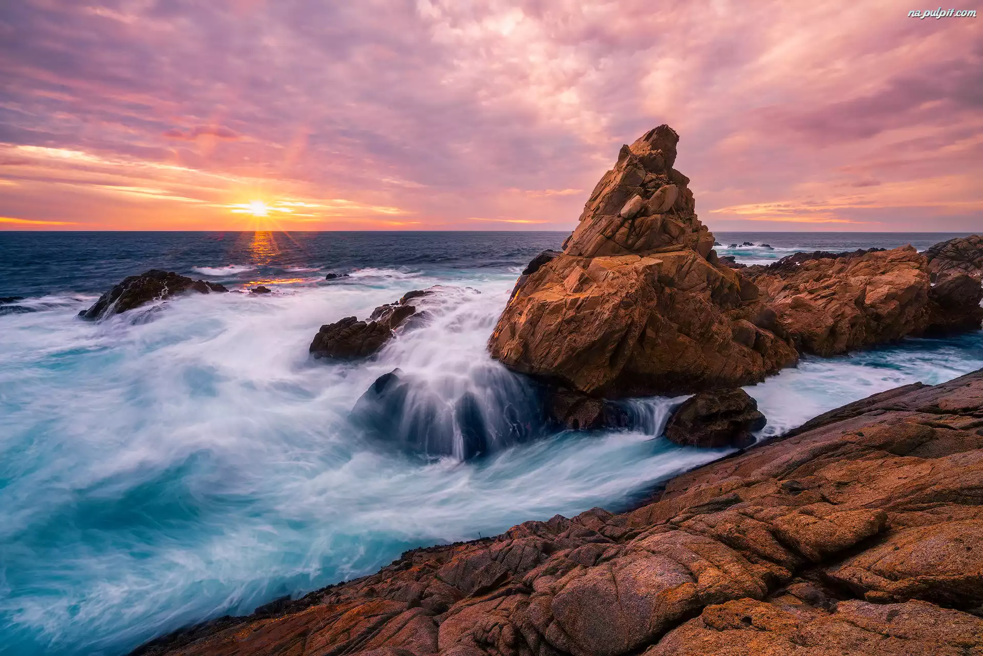 Skały, Zachód słońca, Niebo, Morze, Zaróżowione, Wybrzeże Na Pulpit