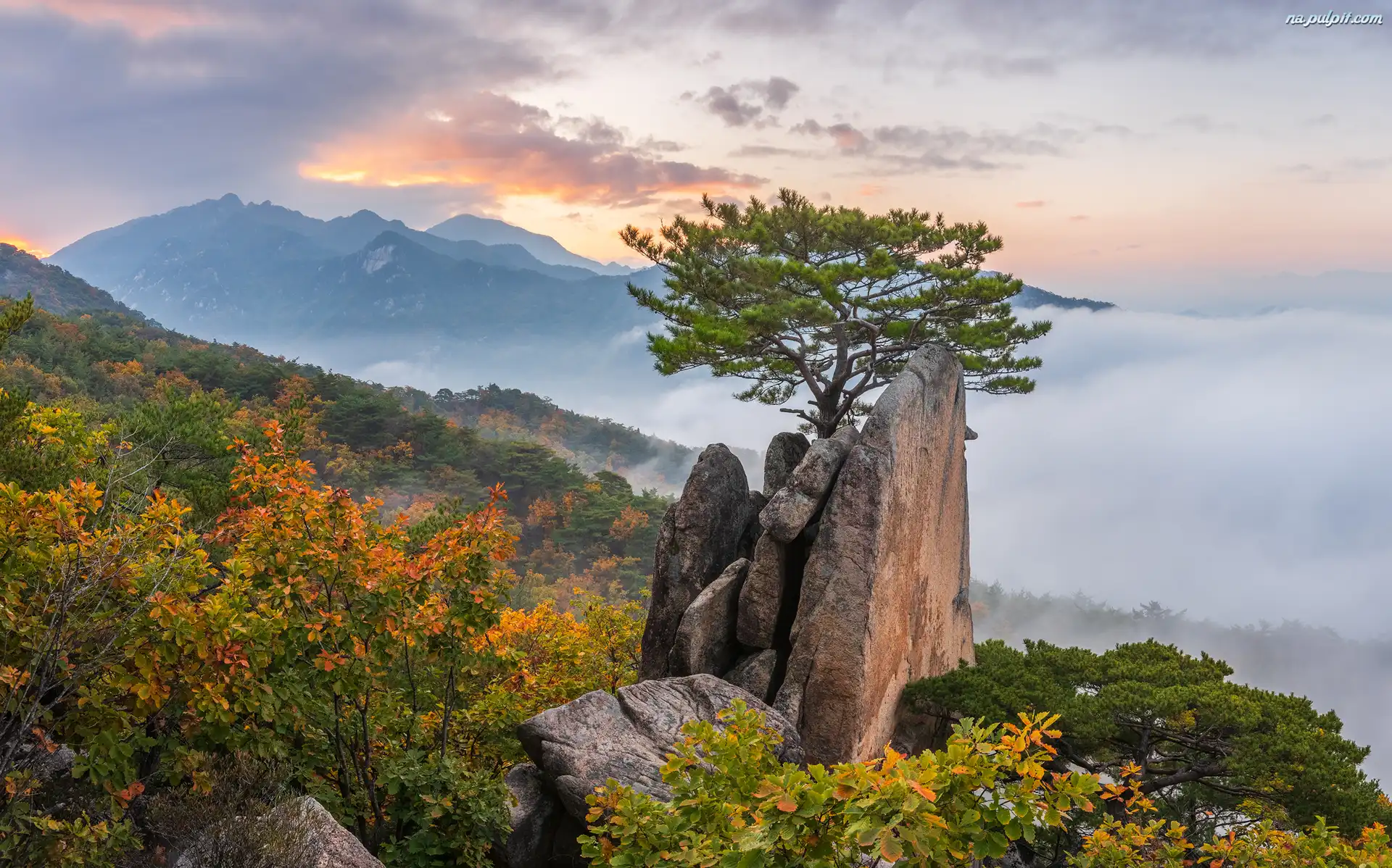 Chmury, Drzewo, Sosna, Skała, Lasy, Jesień, Mgła, Góry, Niebo Na Pulpit