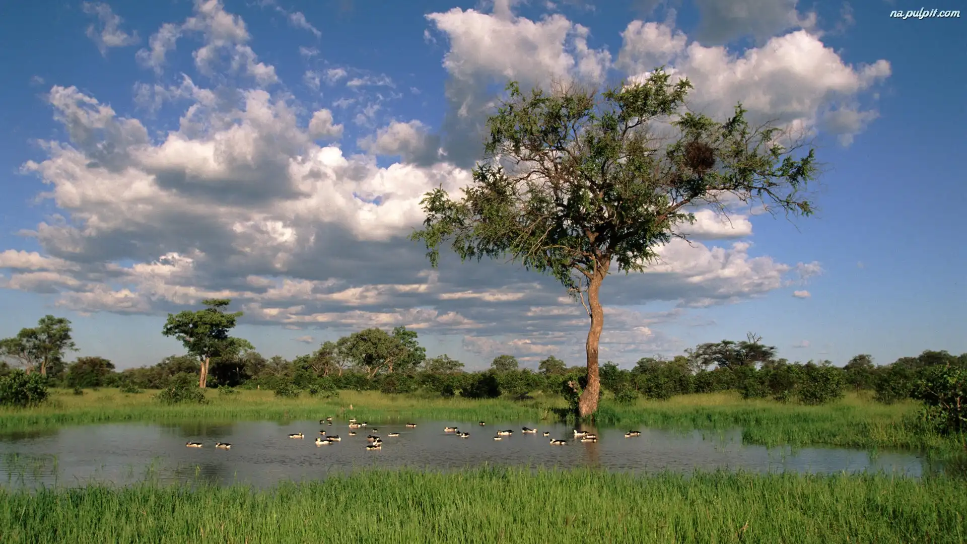 Niebo, Drzewa, Staw, Kaczki Na Pulpit