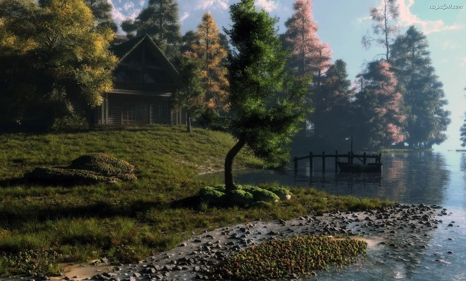 Niebo, Trawa, Drzewa, Woda, Domek Na Pulpit