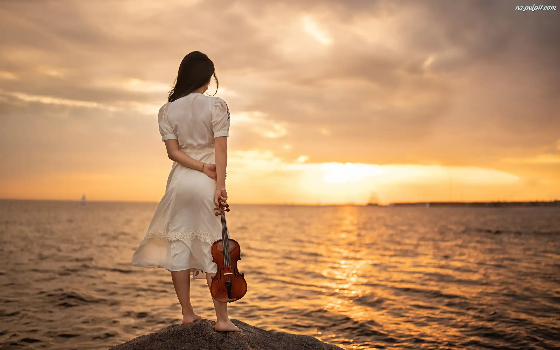 Chmury, Kamienie, Wschod słońca, Kobieta, Skrzypce, Morze, Niebo Na Pulpit