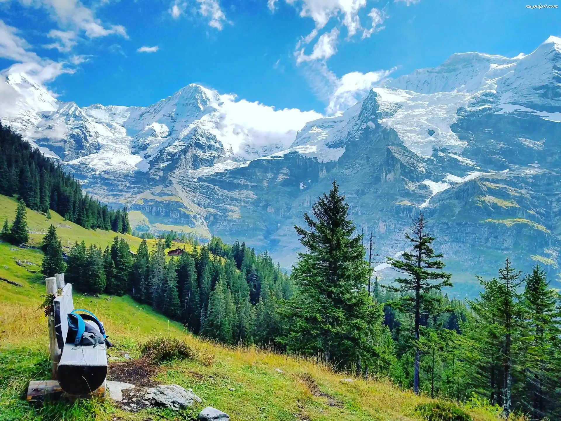 Śnieg, Domki, Ławeczka, Las, Góry, Drzewa Na Pulpit