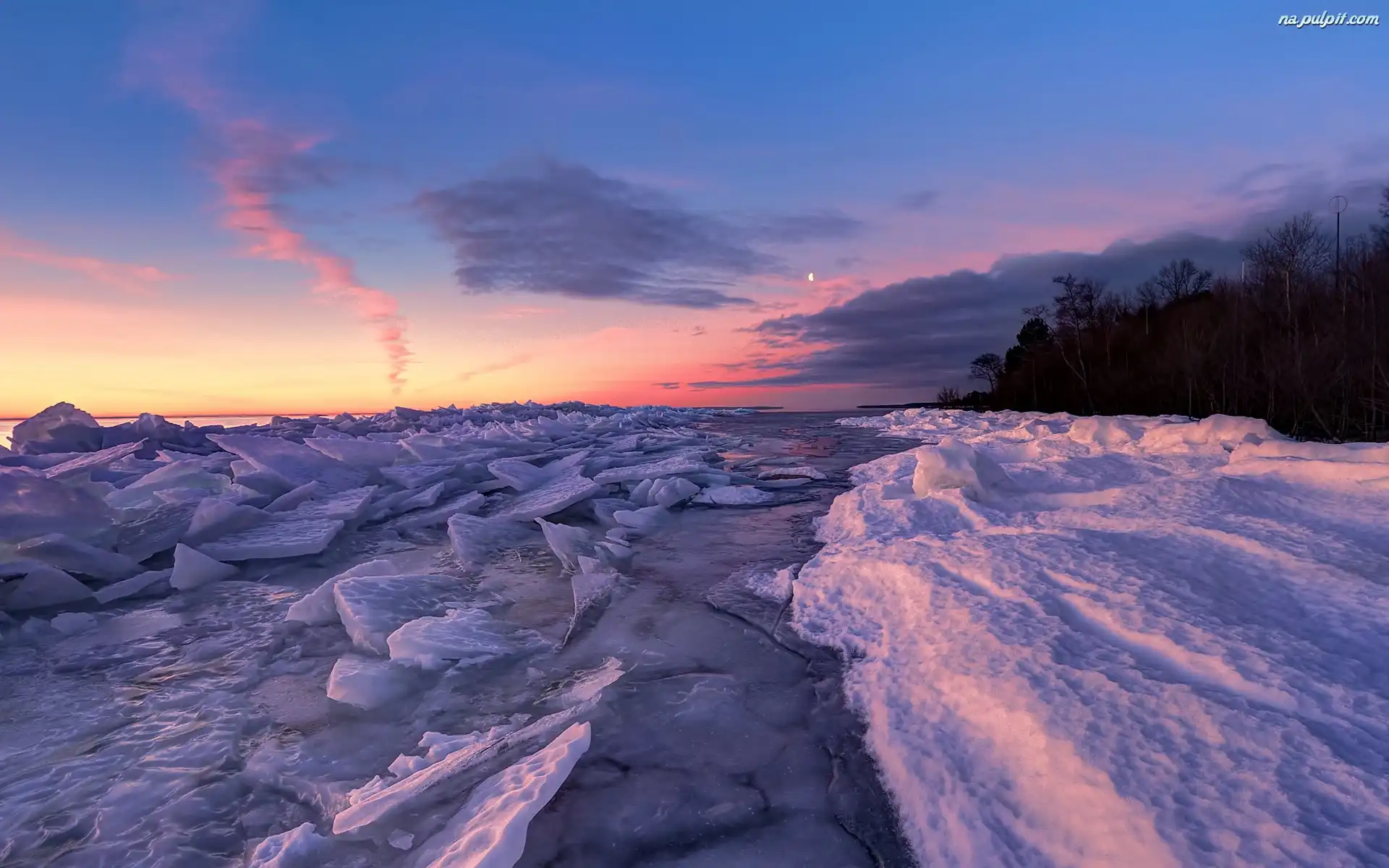 Śnieg, Zachód, Słońca, Lód, Brzeg, Drzewa