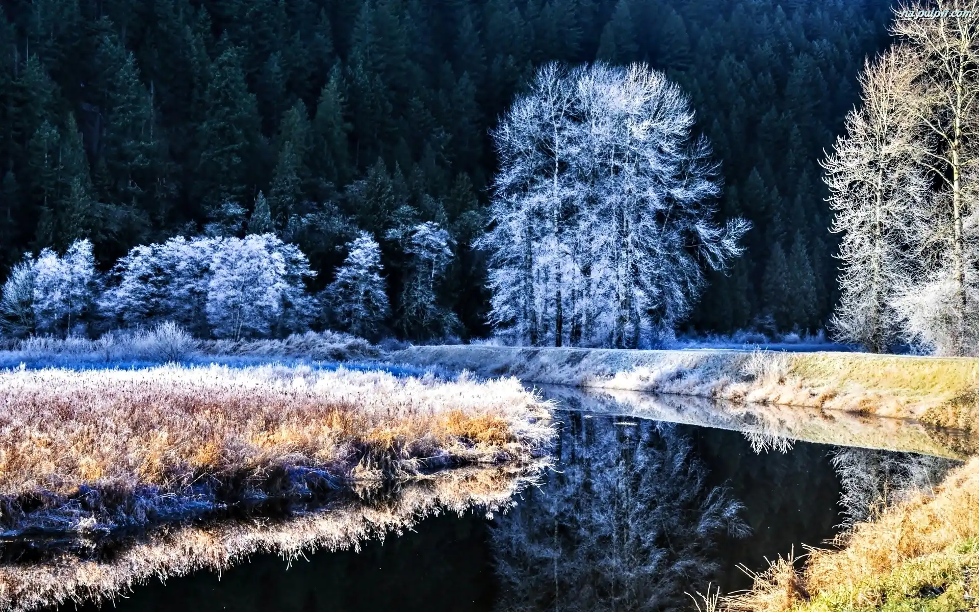 Åšnieg, Szron, Noc, Rzeka, Zima, Drzewa Na Pulpit