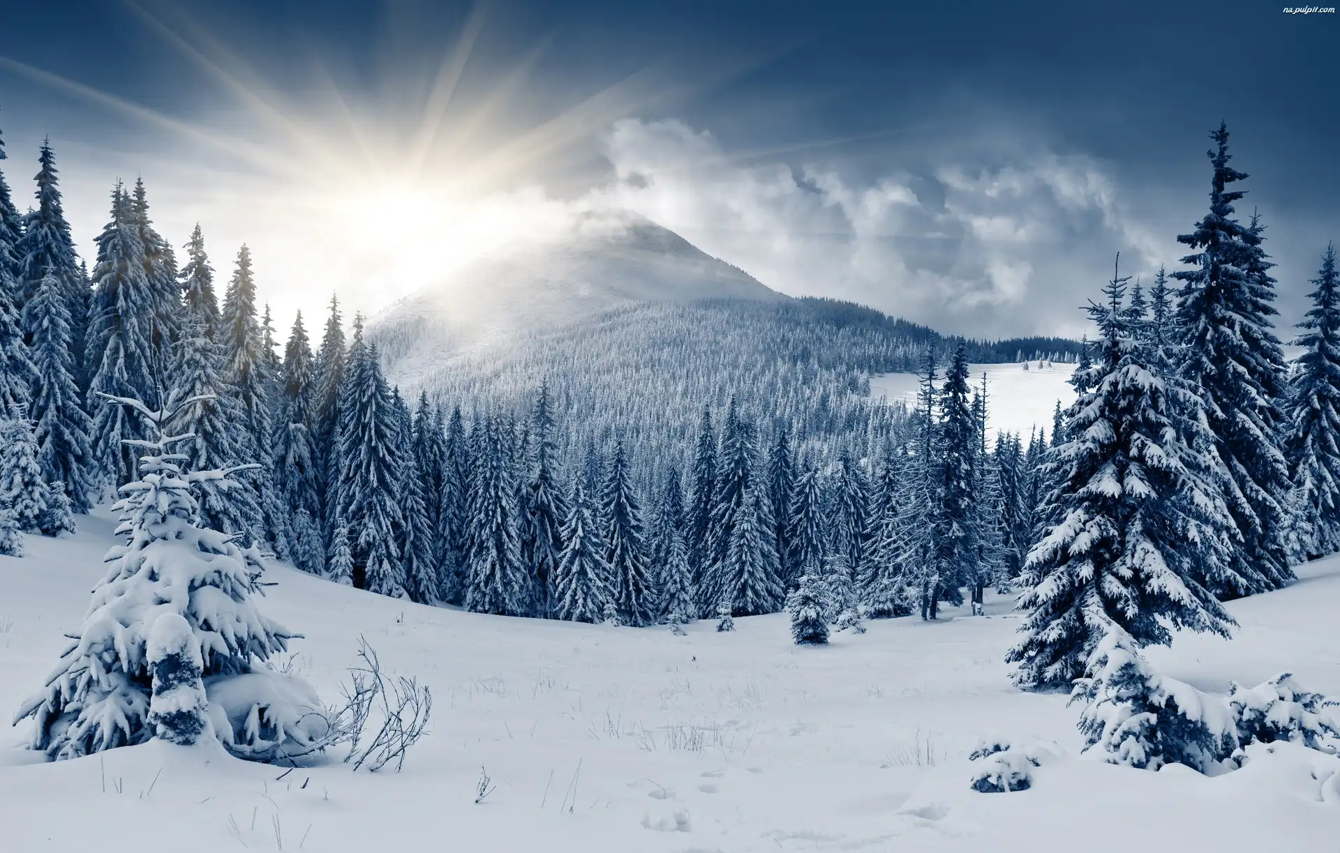 Śnieg, Promienie, Słońca, Świerki, Zima, Góry