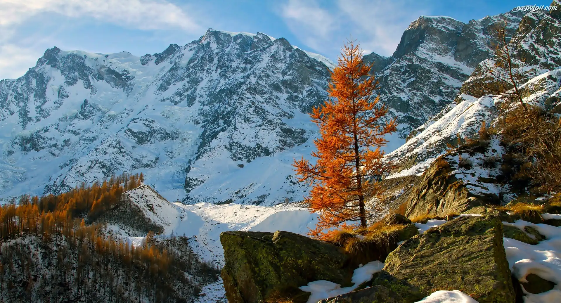 Śnieg, Drzewa, Jesień, Kamienie, Góry, Skały