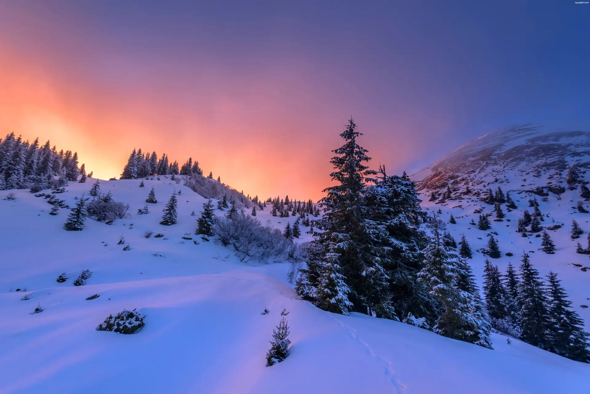 Śnieg, Drzewa, Góry, Zima, Zachód Słońca