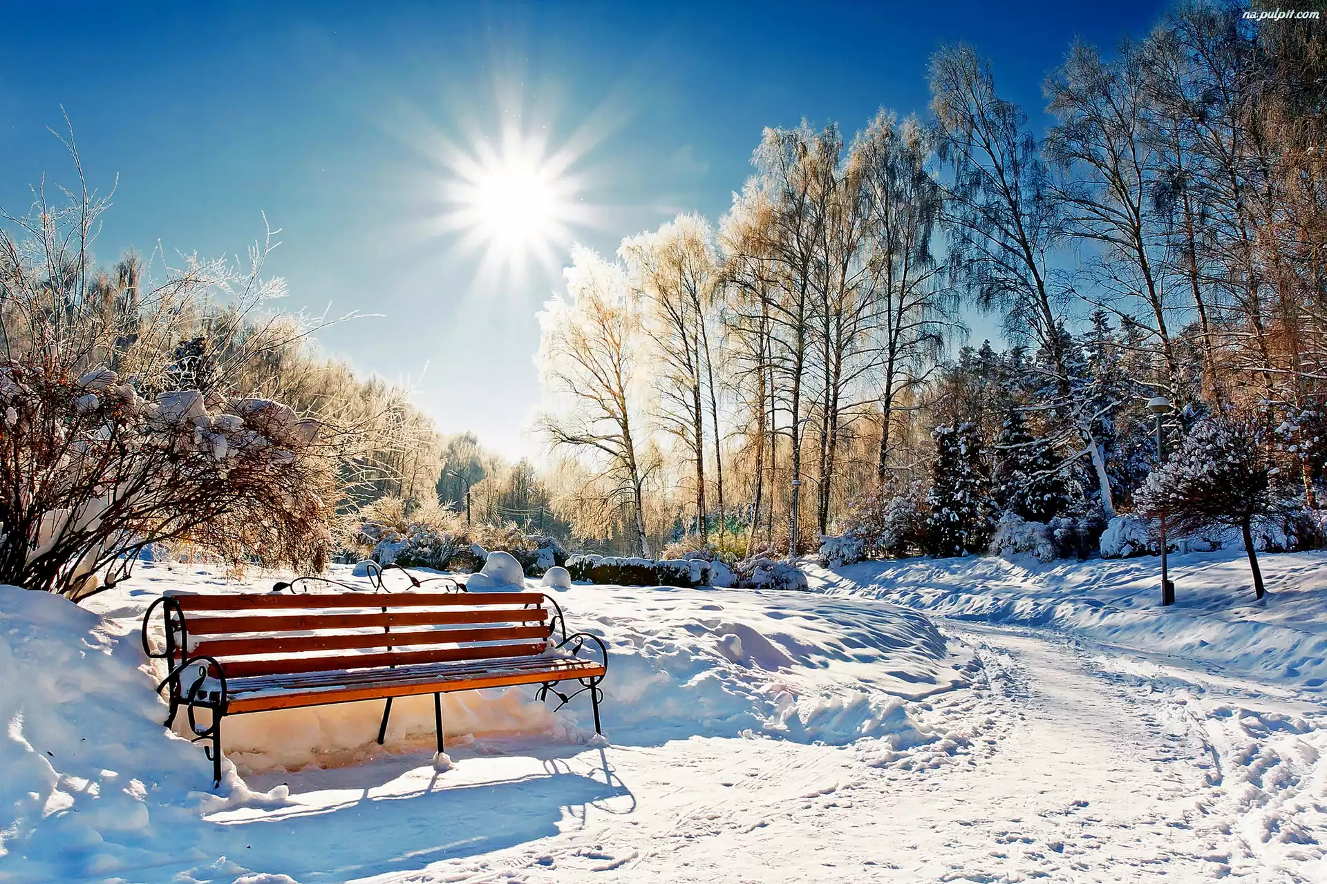 Śnieg, Promienie Słońca, Park, Drzewa, Zima, Ławka Na Pulpit