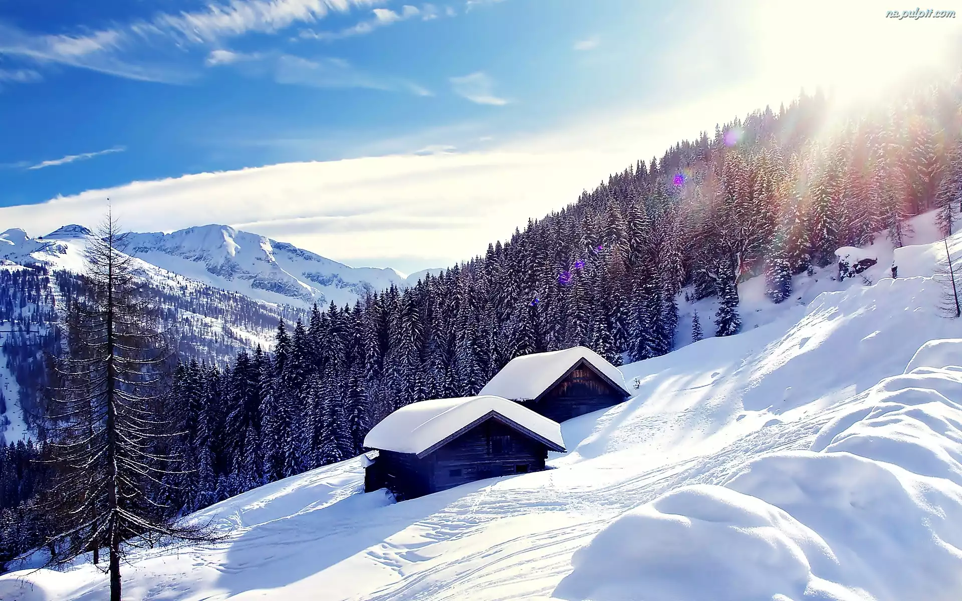 Słońca, Śnieg, Promienie, Góry, Alpy, Zima, Domki Na Pulpit