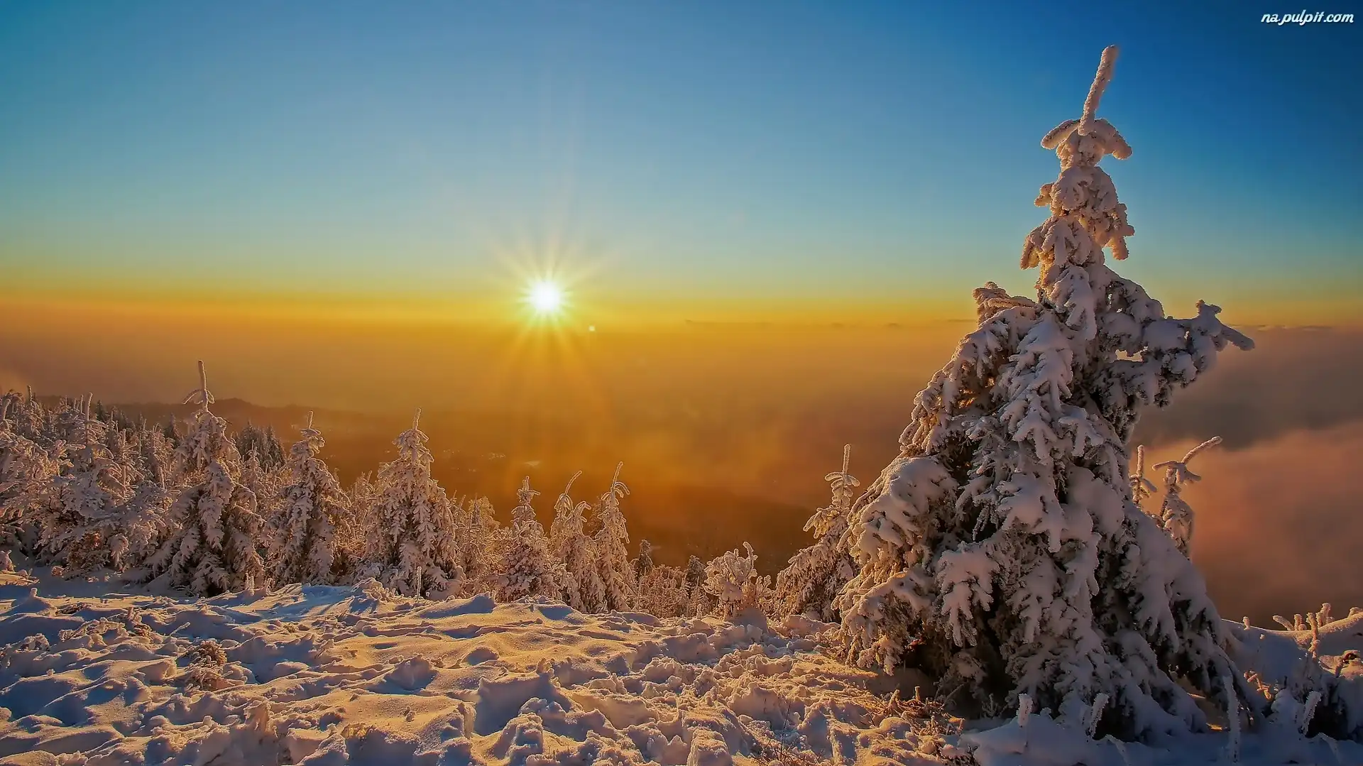 Wzgórza, Śnieg, Wschód słońca, Ośnieżone, Zima, Drzewa Na Pulpit