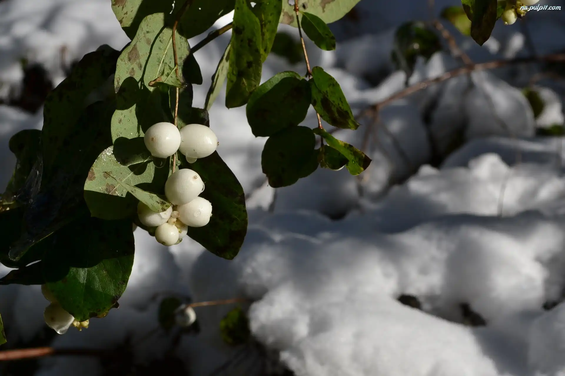 Śnieguliczki, Wody, Śnieg, Owocniki, Gałązka, Krople