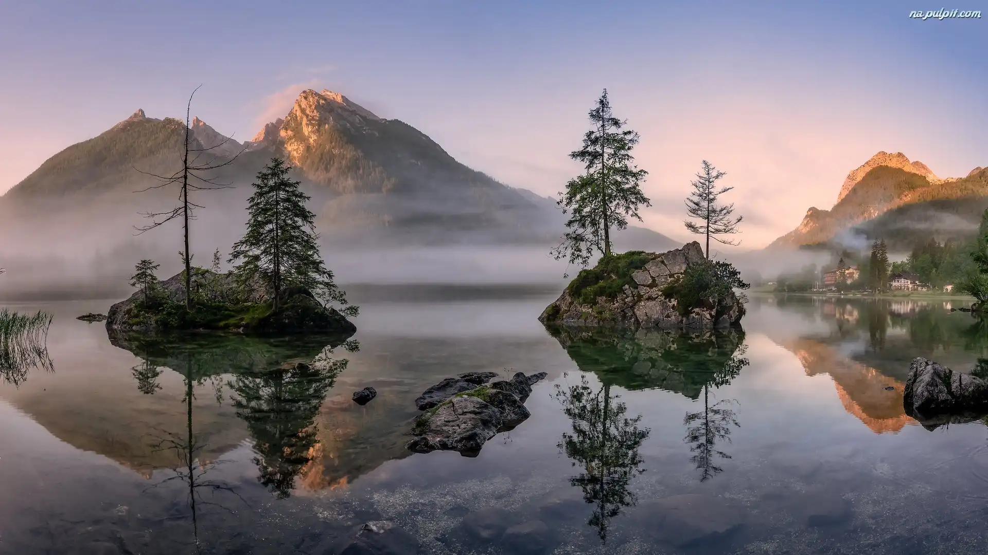 Mgła, Drzewa, Hintersee, Niemcy, Bawaria, Jezioro, Skały Na Pulpit