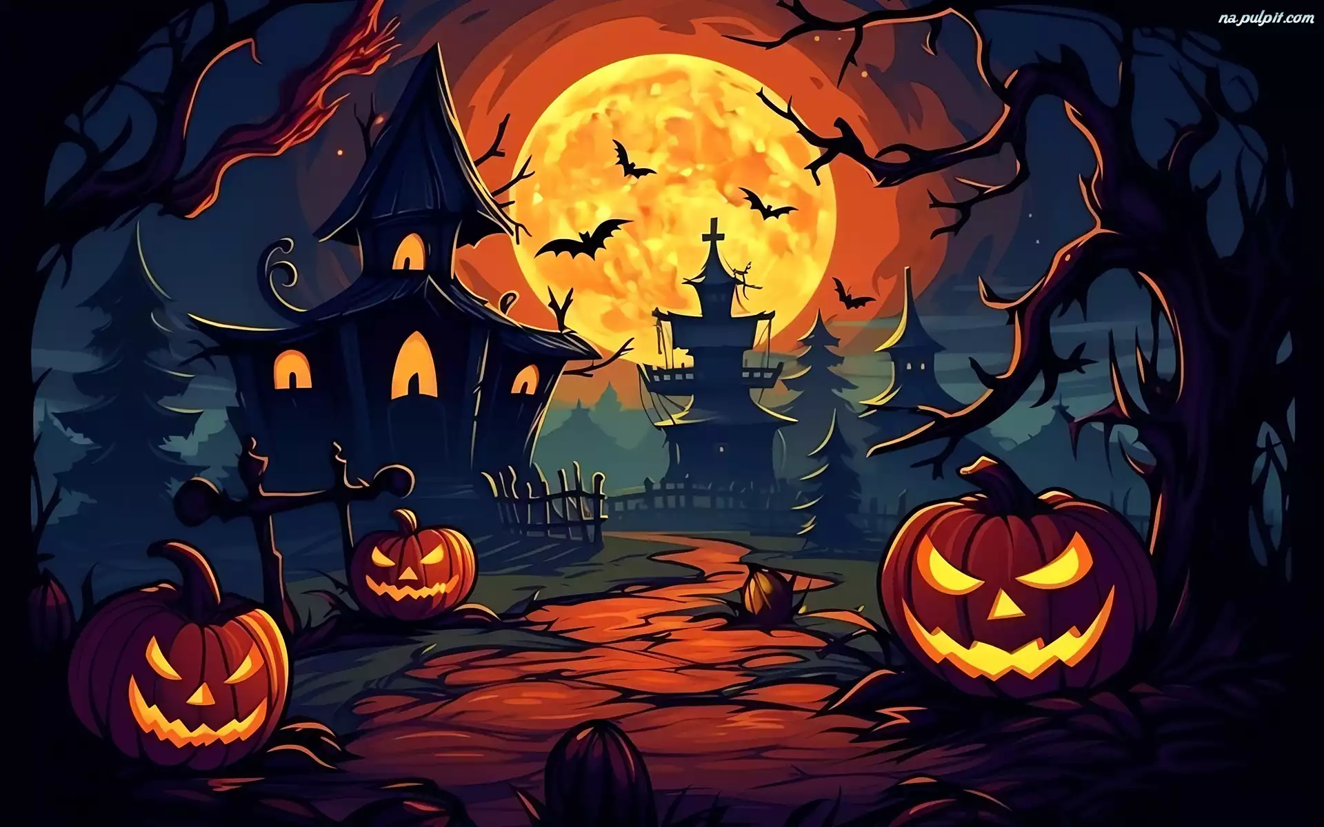 Nietoperze, Księżyc, Droga, Noc, Świecące, Drzewa, Halloween, Domy, Dynie, Ptaki Na Pulpit
