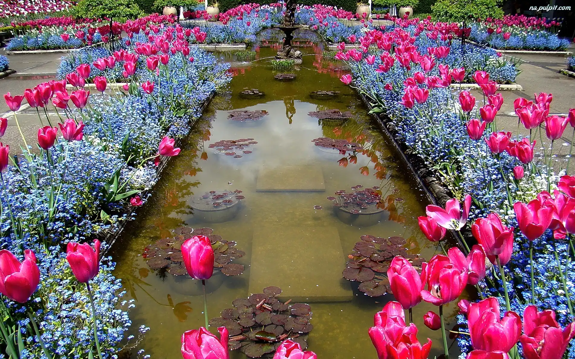 Niezapominajki, Tulipany, Różowe, Fontanna, Niebieskie Na Pulpit