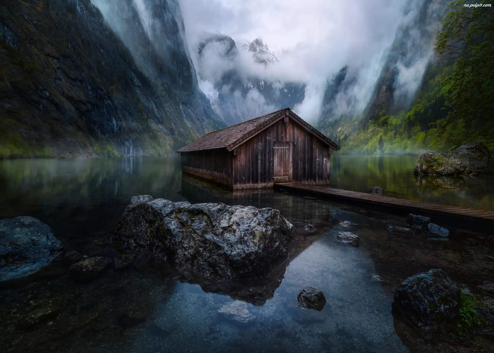 Bawaria, Drewniany, jezioro Königssee, Park Narodowy Berchtesgaden, Kamienie, Góry, Mgła, Domek, Niemcy, Kładka Na Pulpit |