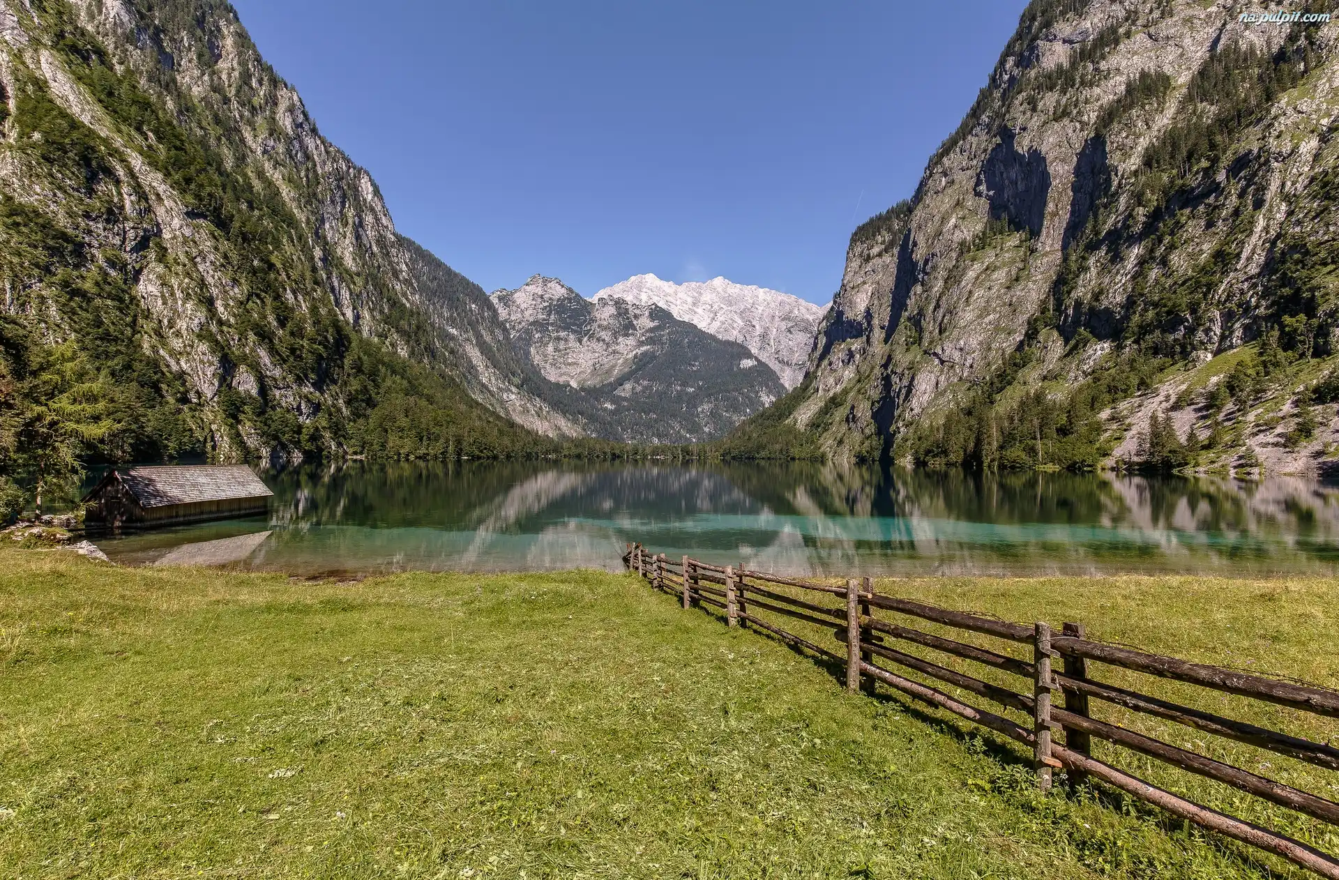 Płot, Bawaria, Łąka, Jezioro Königssee, Park Narodowy Berchtesgaden, Niemcy, Alpy Bawarskie Na Pulpit |