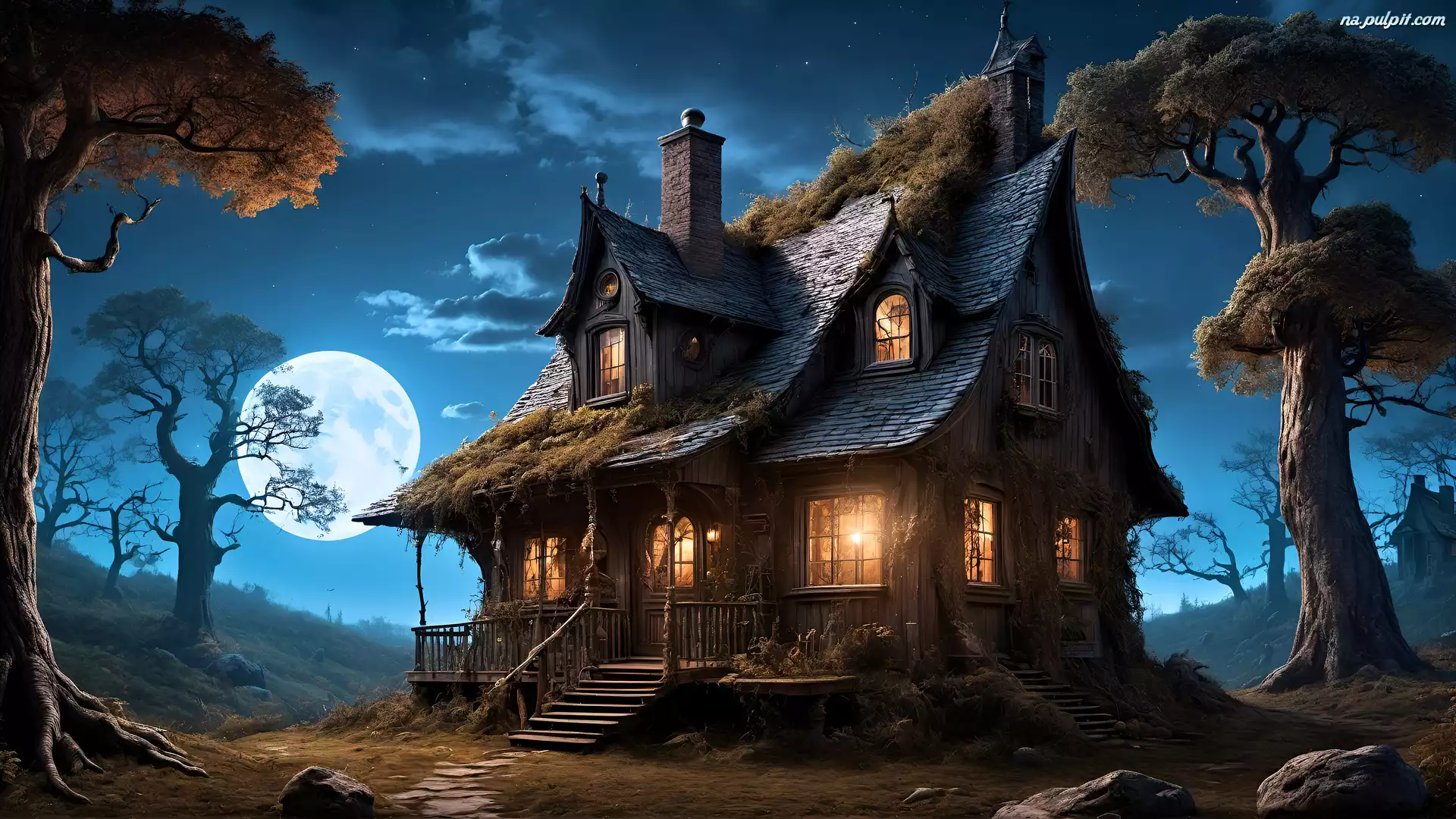 Księżyc, Magiczny, Drzewa, Noc, Dom, 2D Na Pulpit