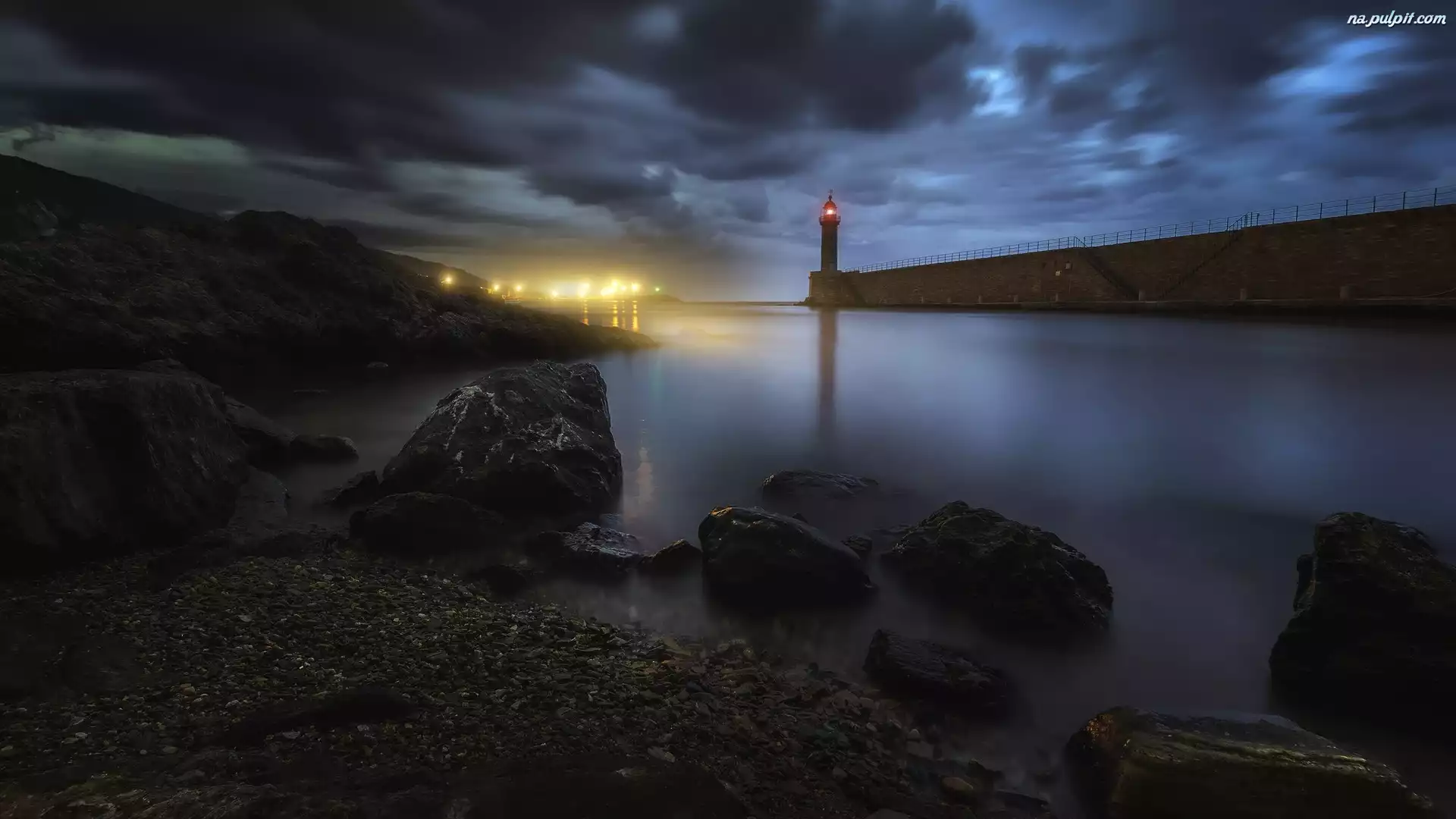 Wybrzeże, Światła, Noc, Skały, Bastia, Korsyka, Francja, Chmury, Morze, Latarnia morska Na Pulpit