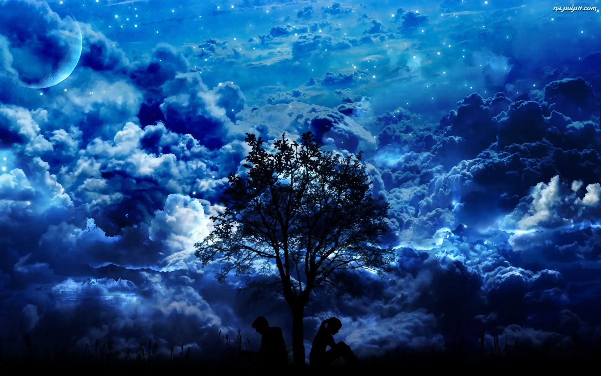 Noc, Drzewo, Chmury, Ludzie Na Pulpit