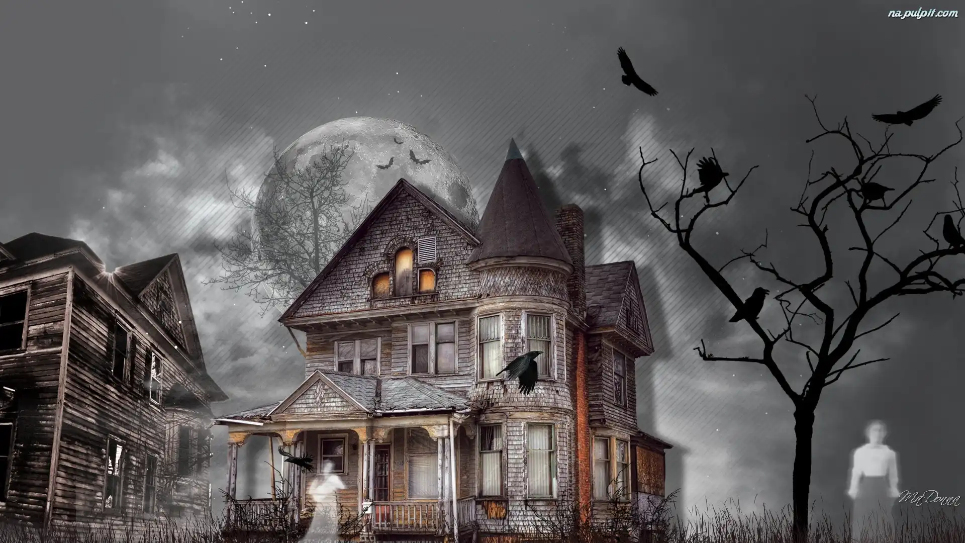 Noc, Ptaki, Drzewo, Domy, Duchy