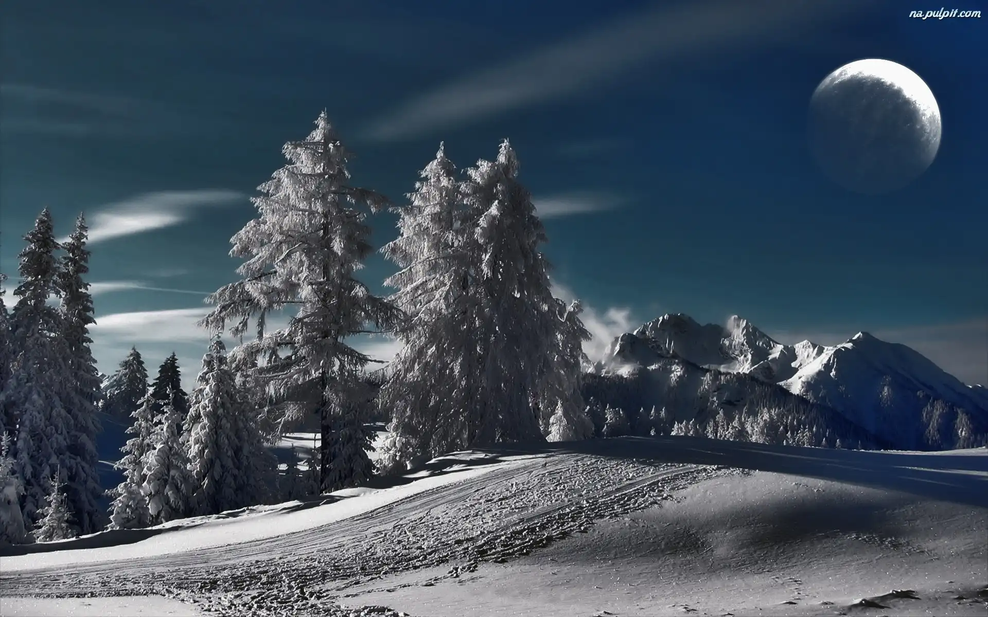 Śnieg, Drzewa, Góry, Noc, Księżyc Na Pulpit