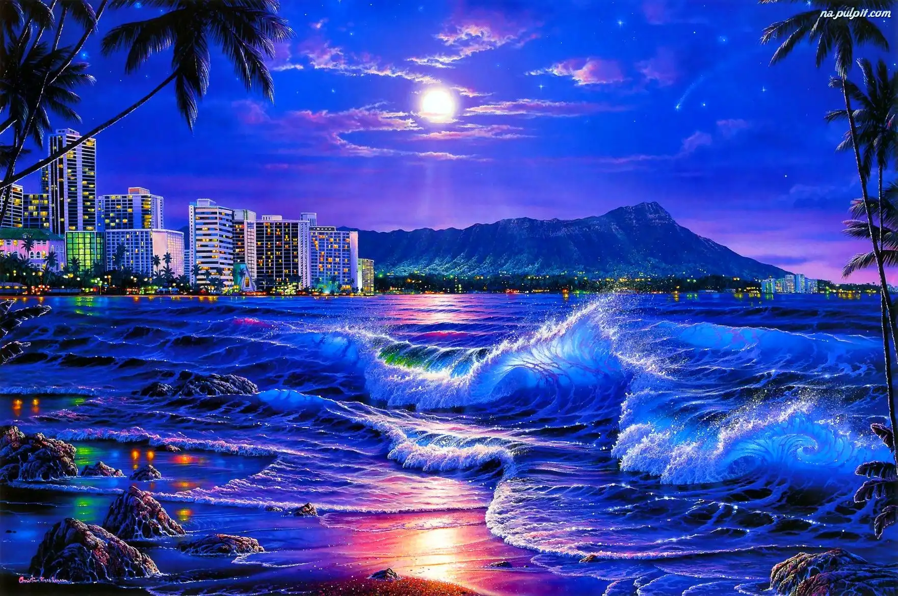 Noc, Wybrzeże, Fale, Miasto Na Pulpit