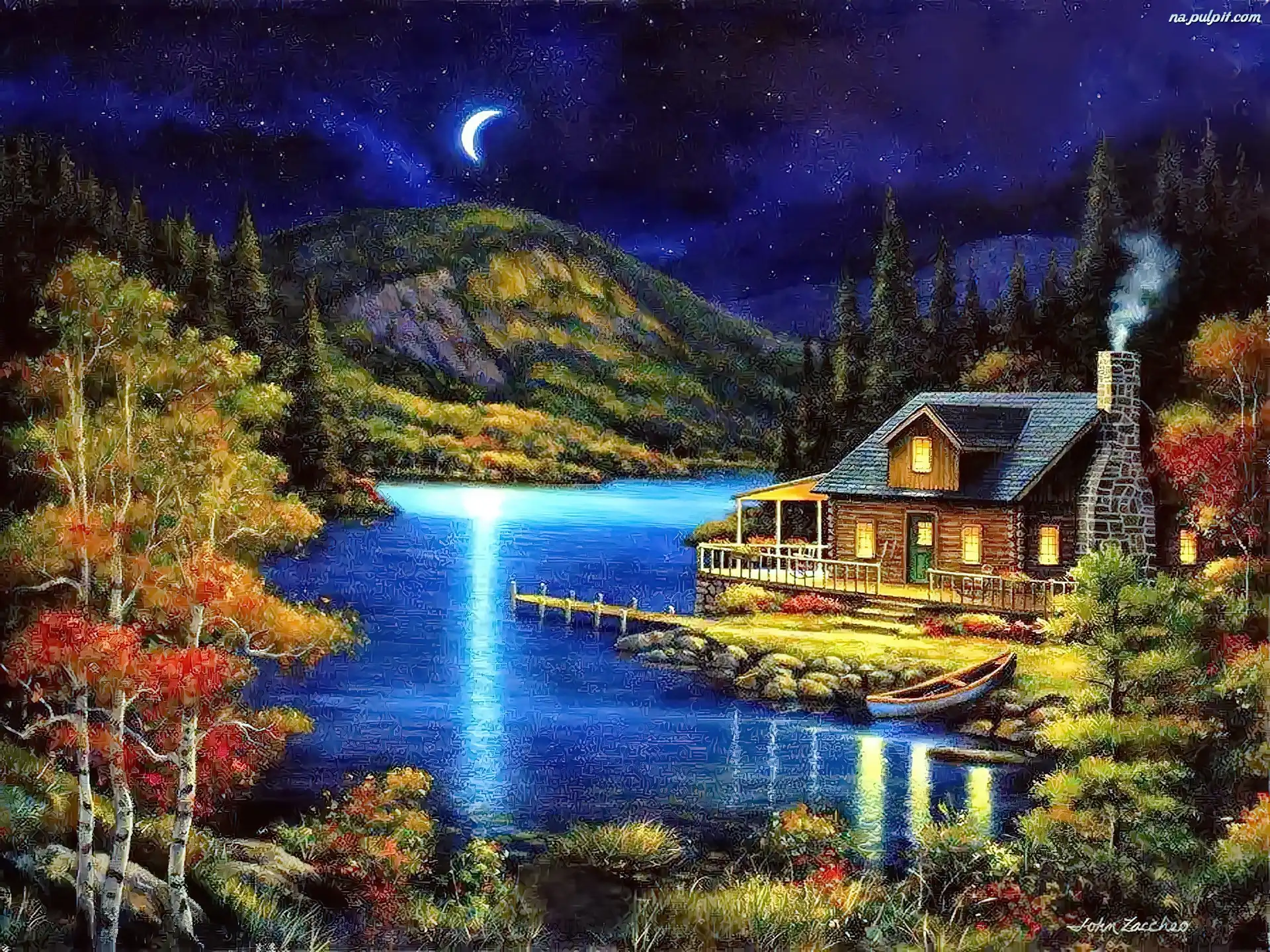Noc, Domek, Jezioro, Góry