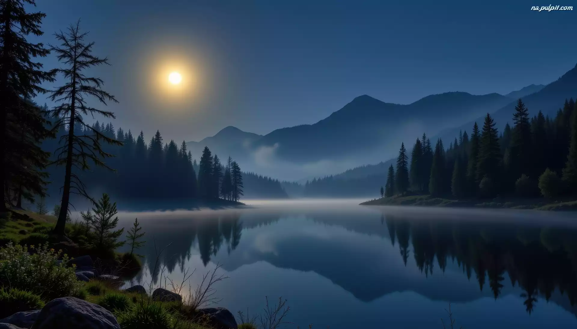AI, Mgła, Jezioro, Noc, Księżyc, Góry, Drzewa Na Pulpit