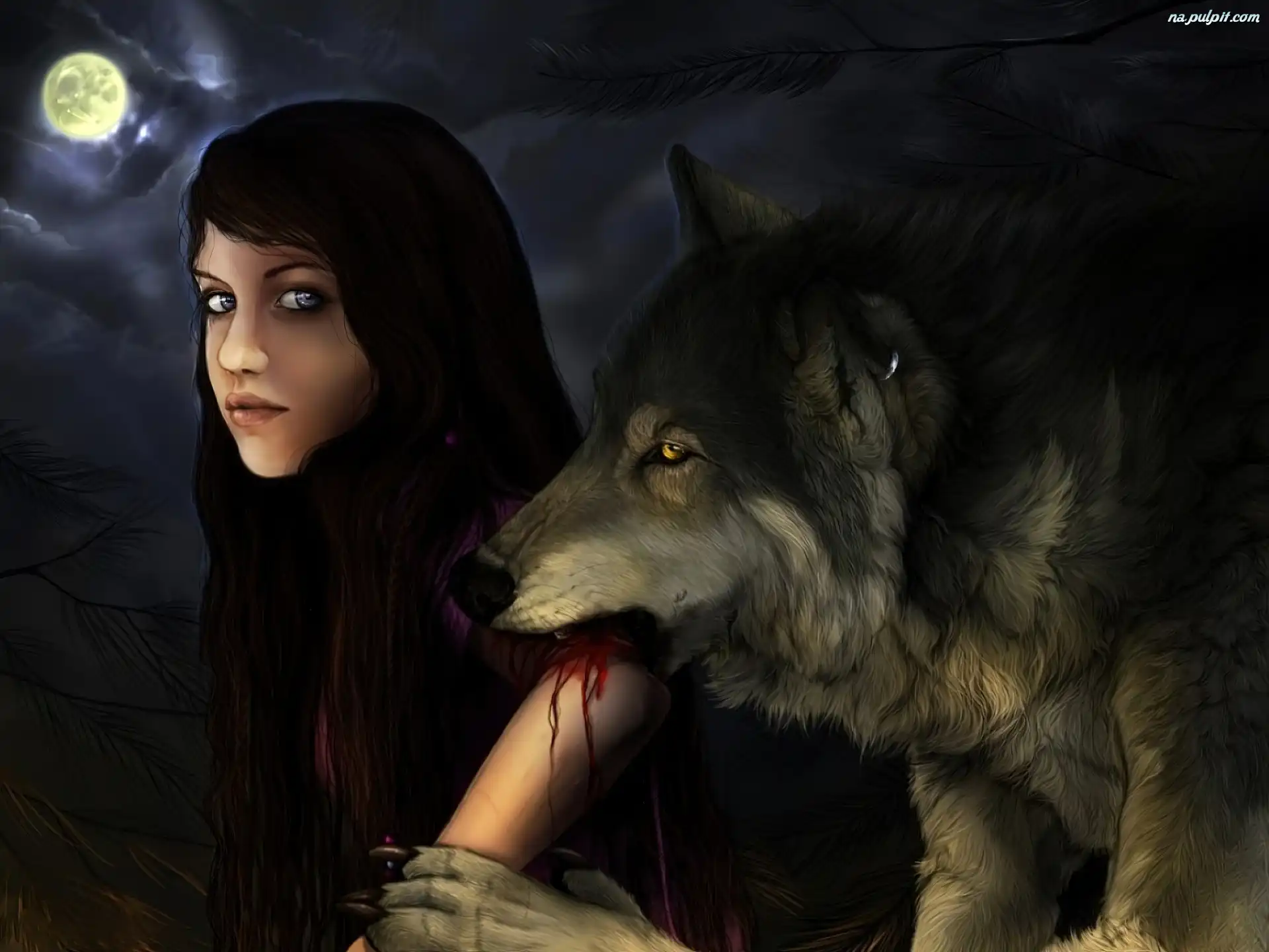 Noc, Wilk, Kobieta, Księżyc Na Pulpit