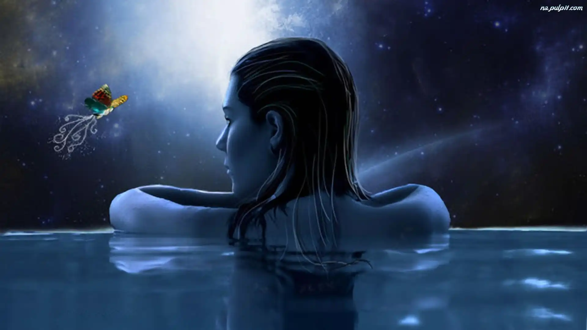 Noc, Woda, Kobieta, Motyl