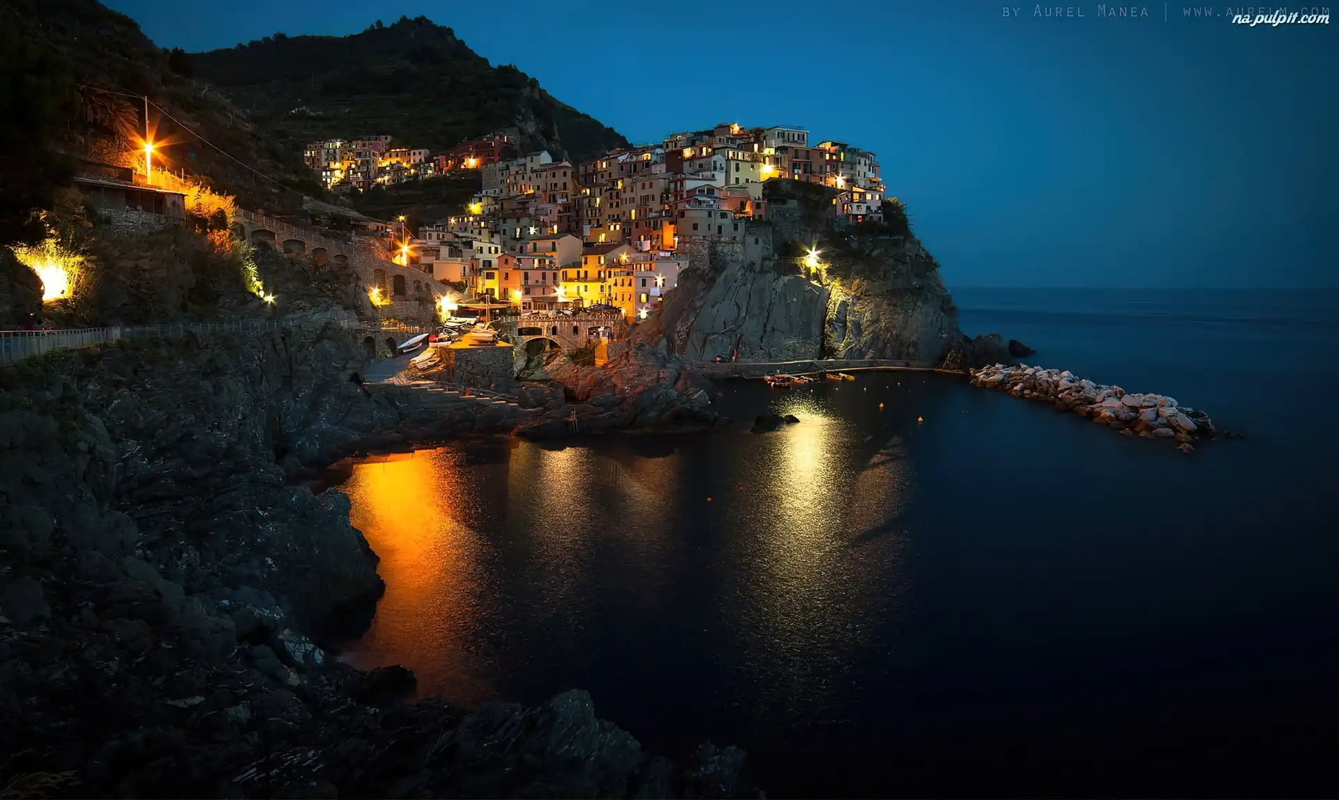 Noc, Włochy, Manarola, Wybrzeże Na Pulpit