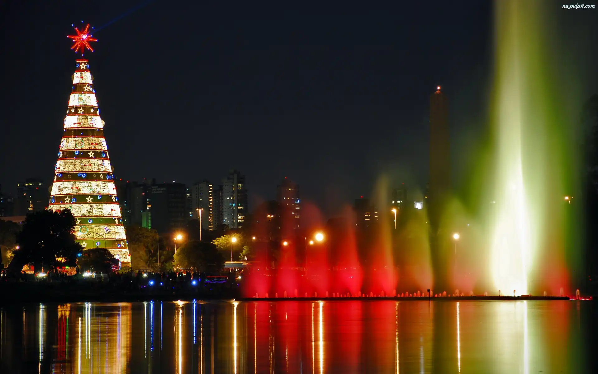 Noc, Blask, Odbicie, Duża, Miasto, Choinka Na Pulpit