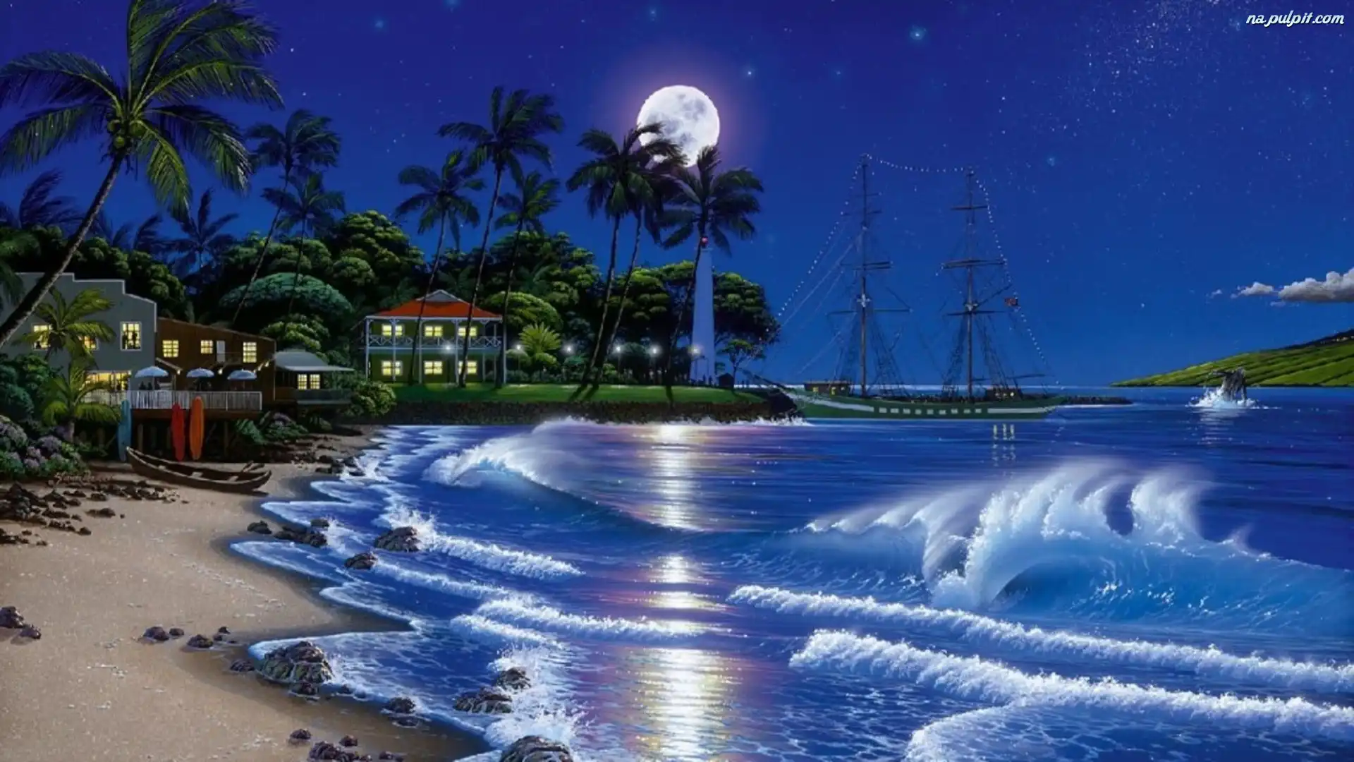 Noc, Plaża, Morze, Palmy Na Pulpit
