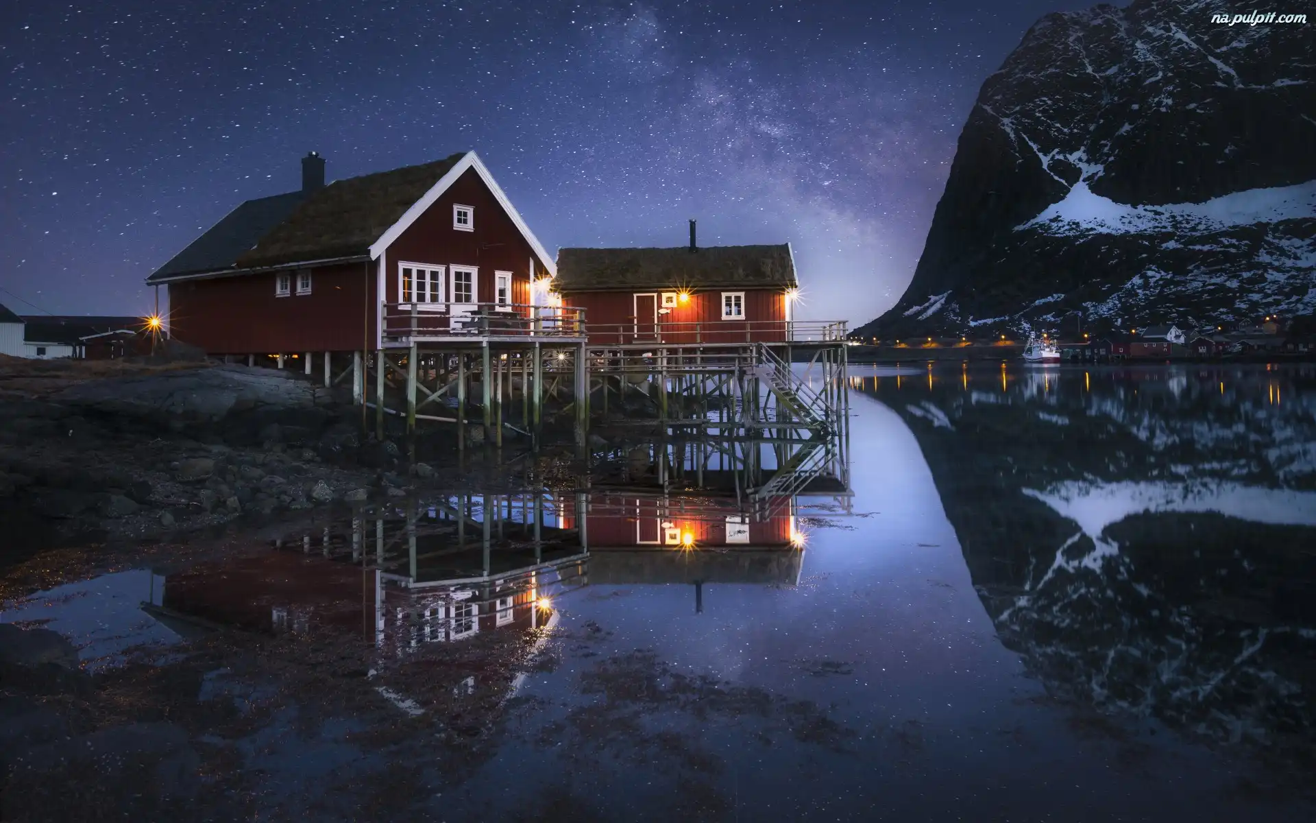 Noc, Domy, Wioska Reine, Norwegia, Góry