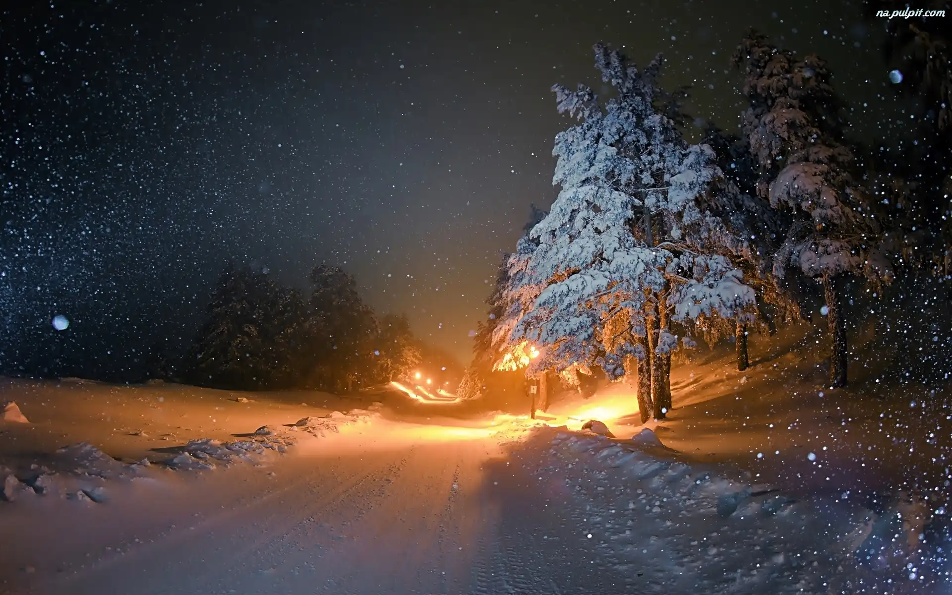 Oświetlenie, Noc, Śnieg, Drzewa, Droga, Zima, Padający Na Pulpit