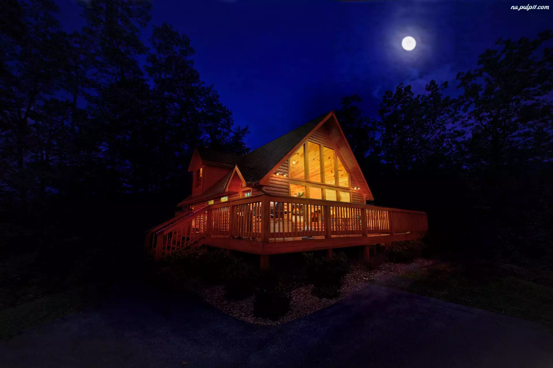 Noc, Dom, Oświetlony, Drzewa Na Pulpit