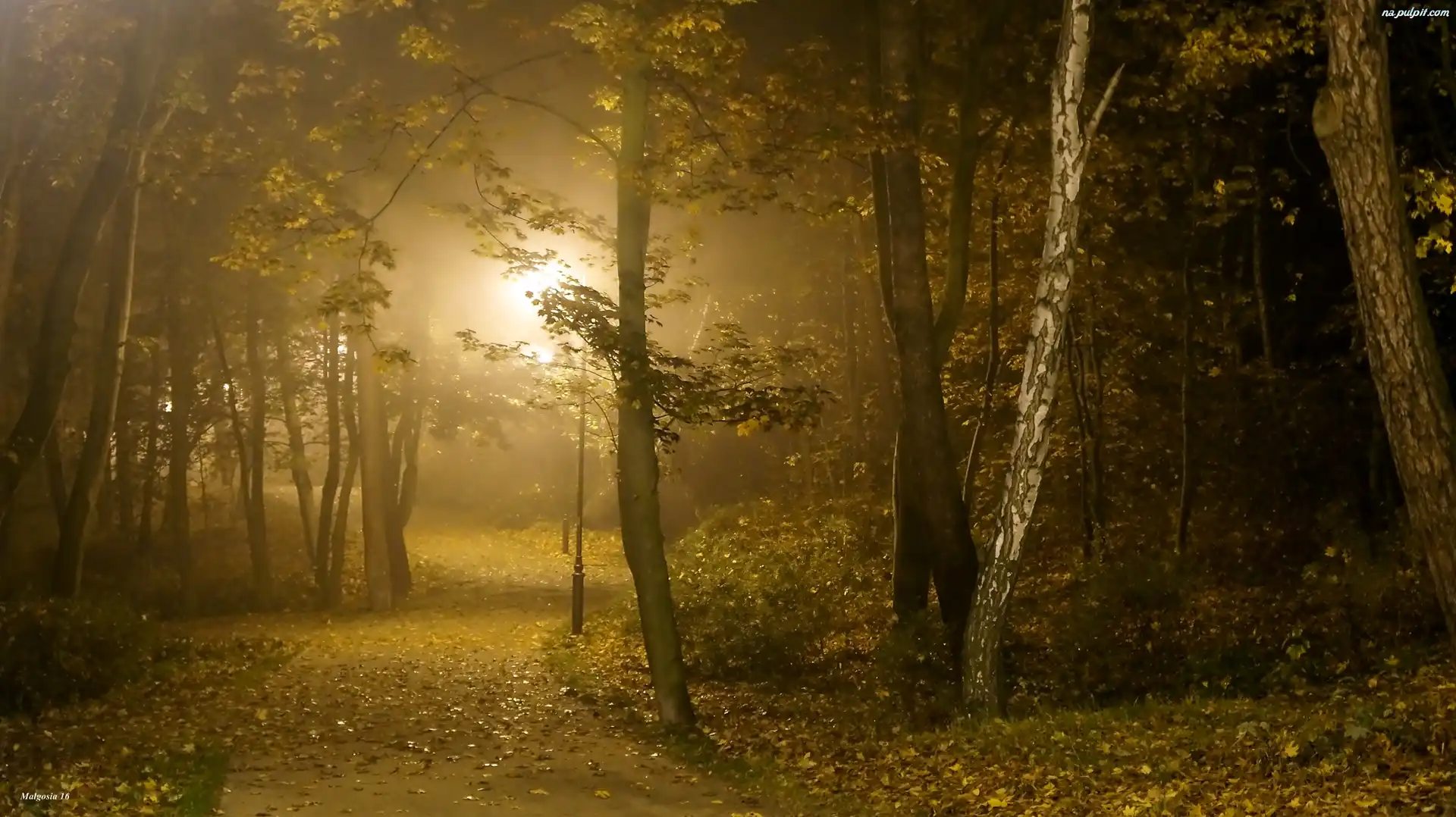Noc, Drzewa, Alejka, Park, Latarnie