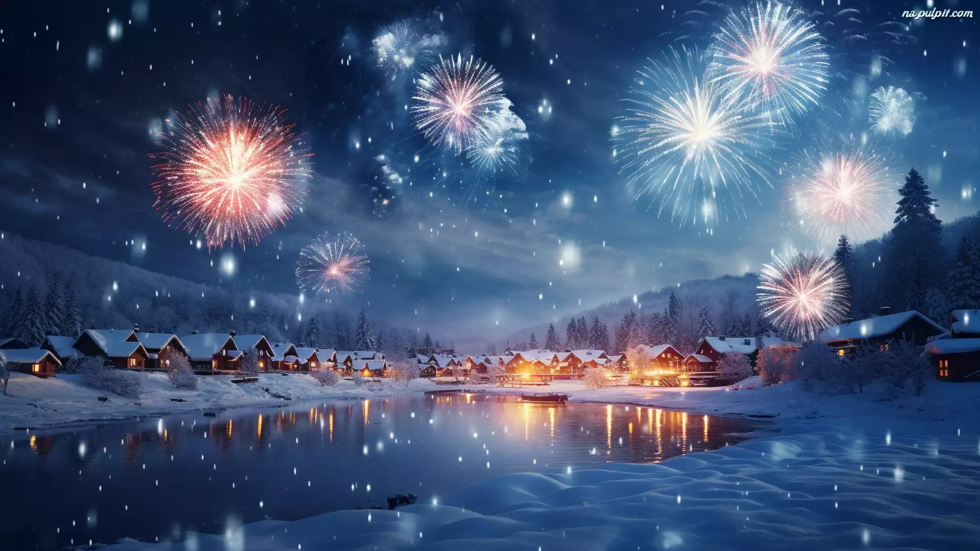 Wioska, Nowy Rok, Noc, Domy, Fajerwerki, Zima Na Pulpit