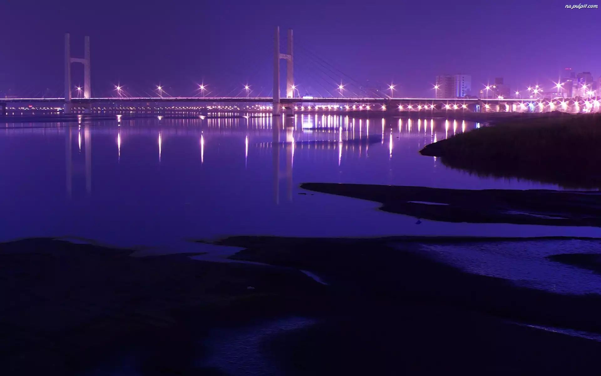 Noc, Oświetlony, Rzeka, Most Na Pulpit