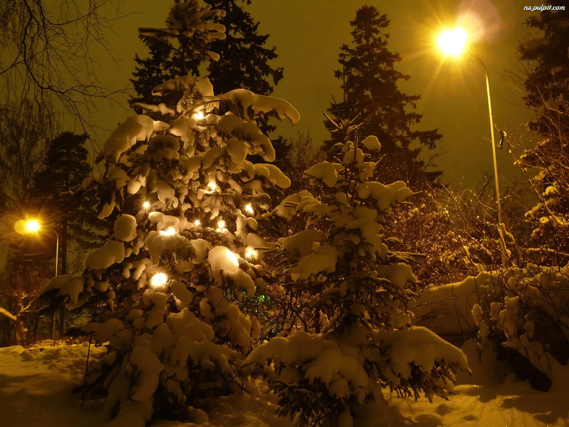 Noc, Oświetlone, Zima, Drzewko Na Pulpit
