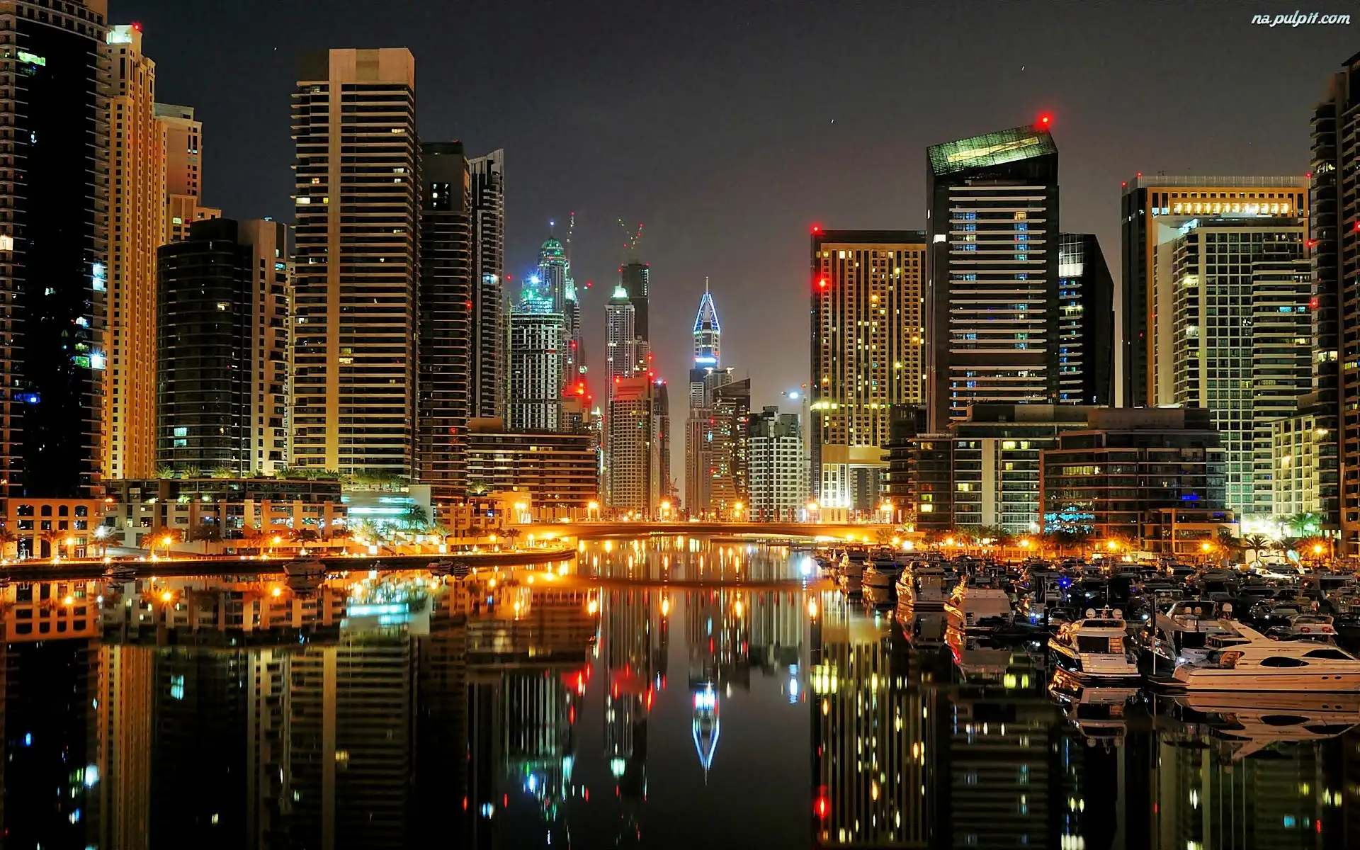 Nocą, Morze, Jachty, Drapacze, Dubaj, Chmur Na Pulpit