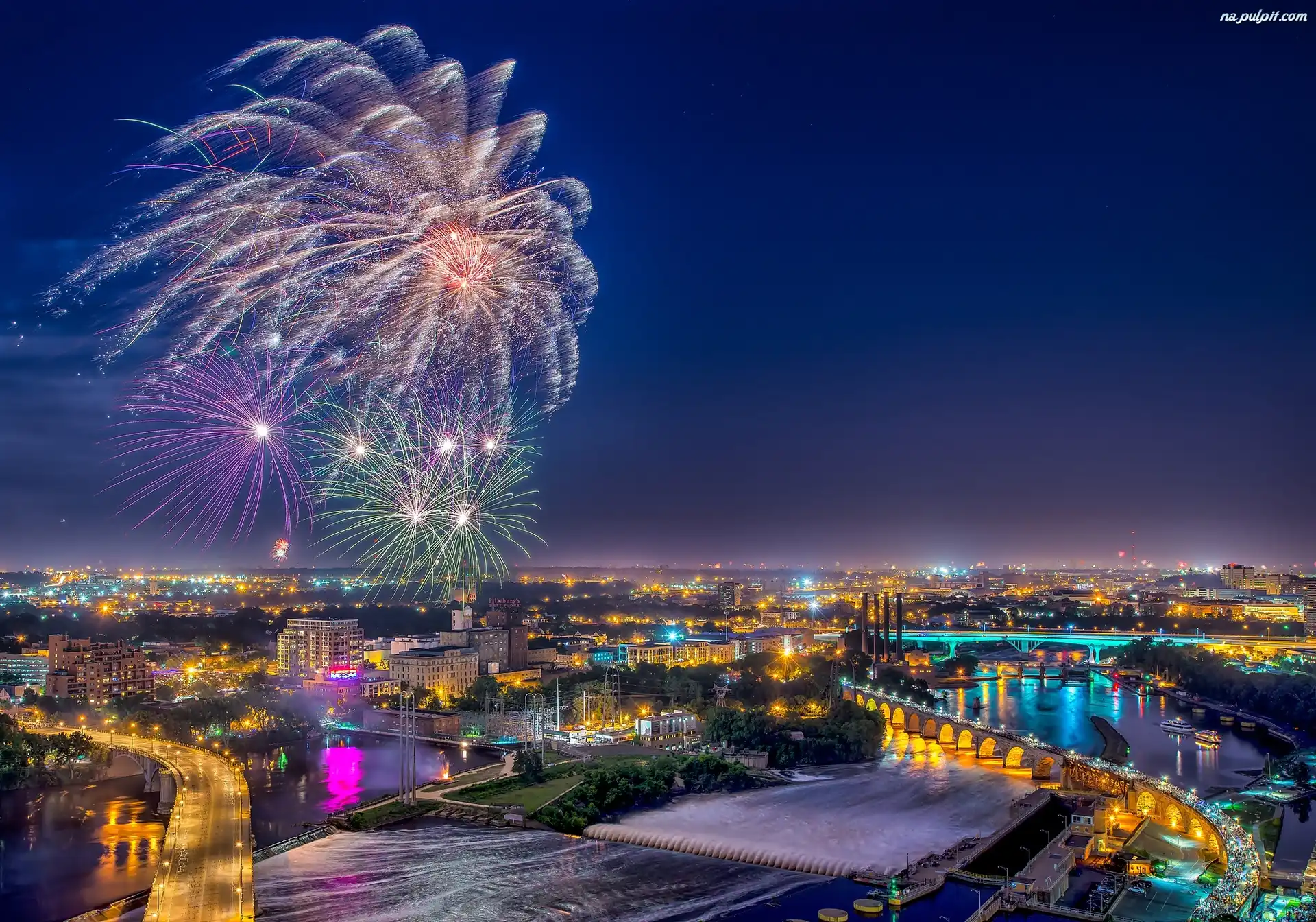 Wisconsin, Nocą, Fajerwerki, Stany Zjednoczone, Stan, Miasto Na Pulpit