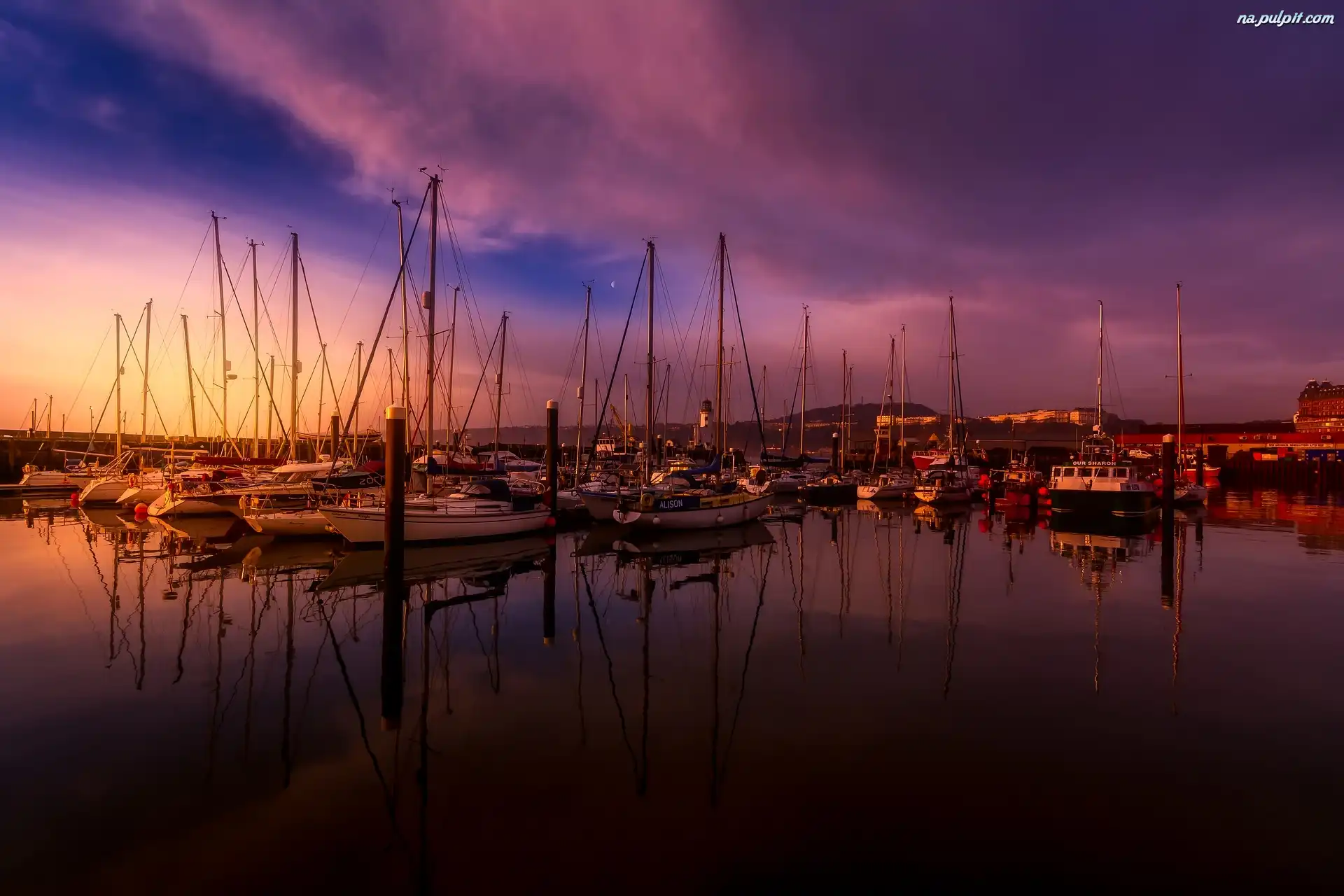Przystań, North Yorkshire, Anglia, Żaglówki, Wschód słońca, Scarborough Na Pulpit