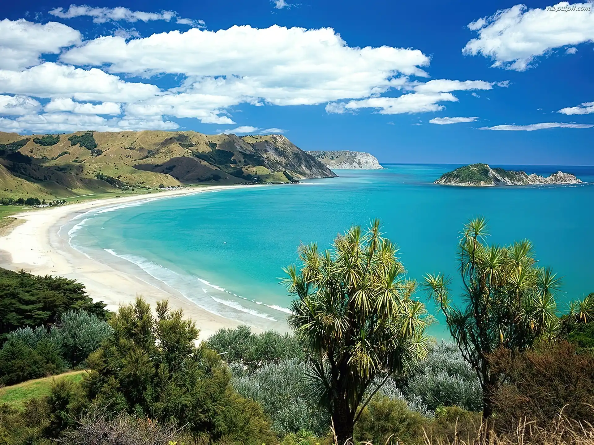 Nowa Zelandia, Wysepka, Plaża, Morze, Roślinność Na Pulpit