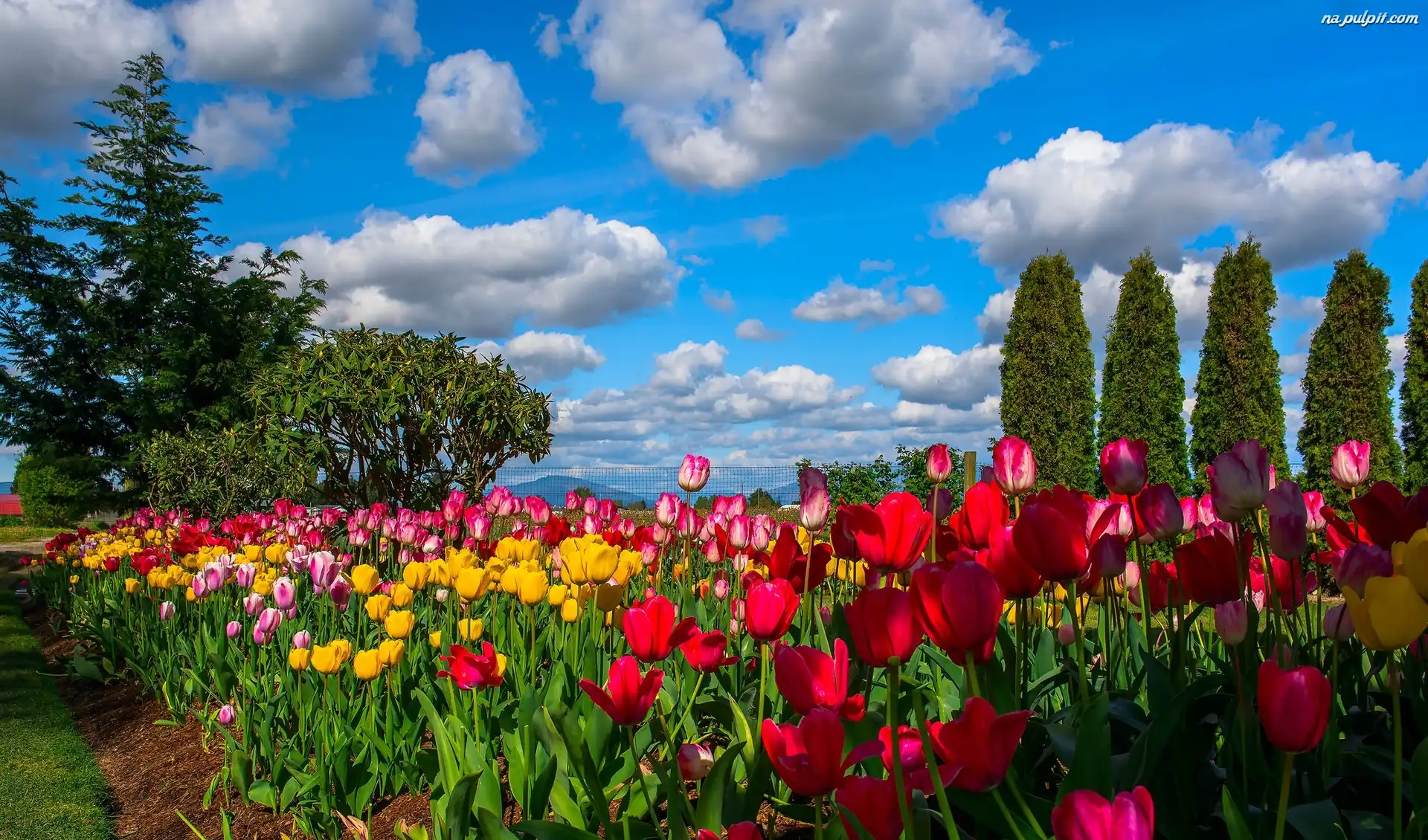 Obłoki, Drzewa, Ogródek, Kolorowe Tulipany, Niebo Na Pulpit